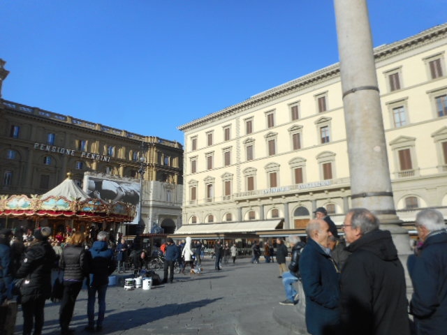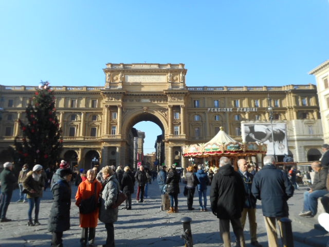 フィレンツェの街中に在る大きな門で、そこは広場になっていてレストランやショツプも在り、大勢の市民や観光客が居ました。メリーゴーランドもあり遊興の広場になっています。近くにデパートのリナシェンテもあり賑やかでした。