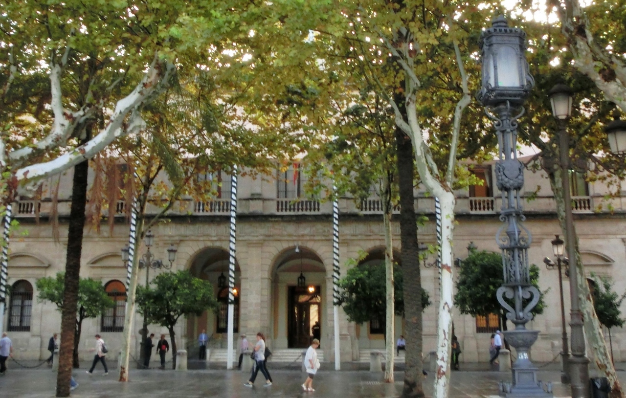 ヌエバ広場に面して建つセビリア行政の中心となる市庁舎です。広場を挟んで市庁舎とは反対側にあるホテルに宿泊していたので、滞在中に何度も前を通りました。ヌエバ広場に面したファサードは、19世紀の新古典様式で落ち着いた外観です。ところが一転、サンフランシスコ広場に面したファサードは、16世紀のプラテレスク様式で、列柱や女性像、レリーフで装飾されていて、別の建物なのかと思ってしまうほど全く違った外観となっていて、見ごたえがありました。