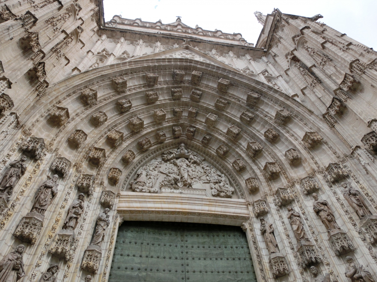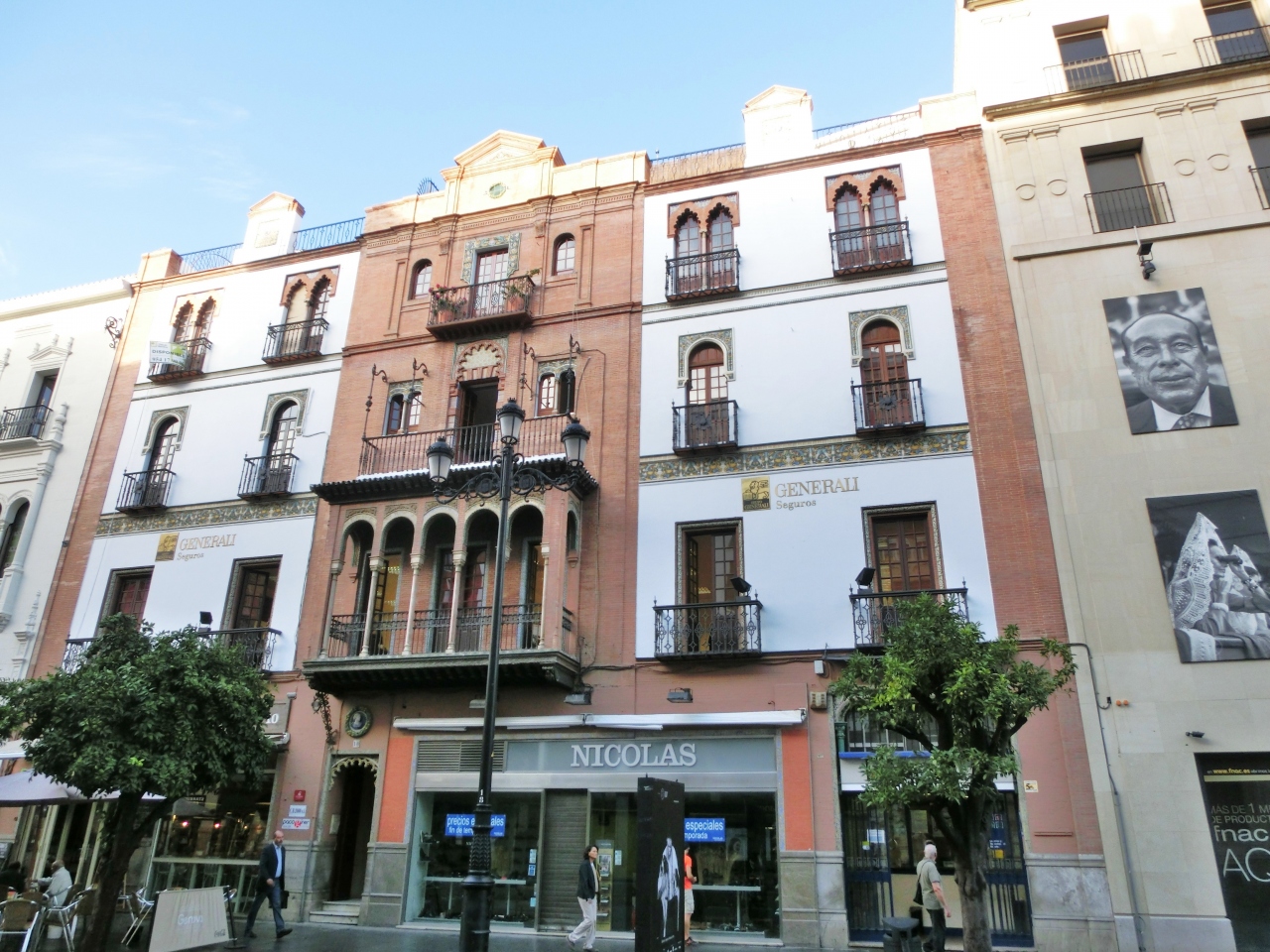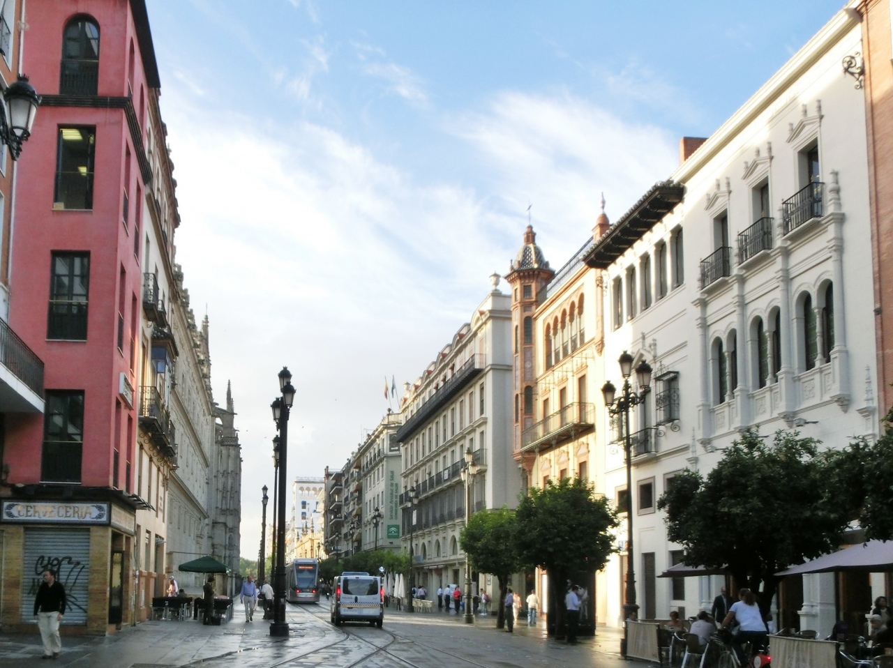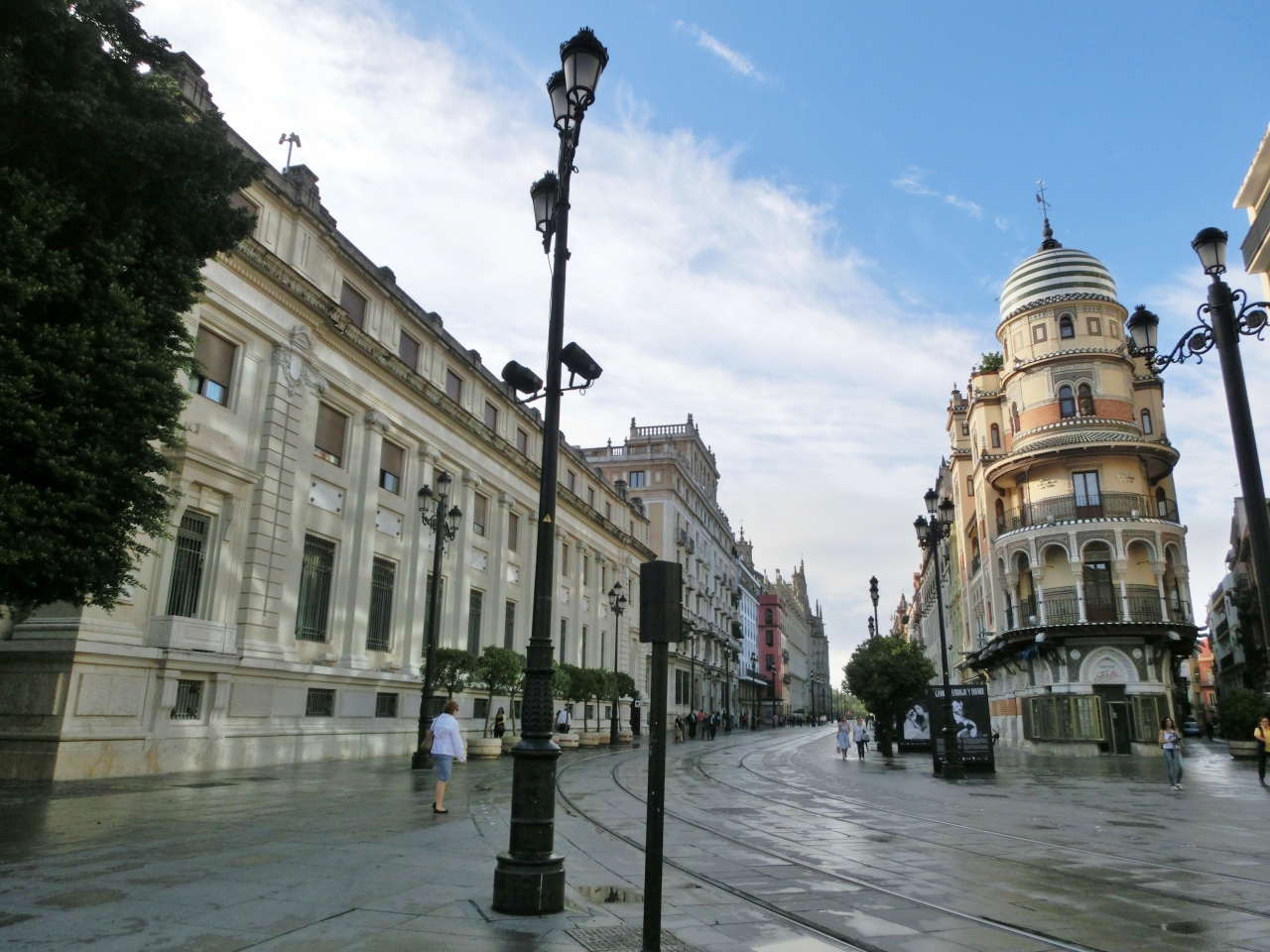 ヌエバ広場の市庁舎からプエルタ・デ・ヘレス広場まで、トラムも走っている600メートルほどの広々とした通りです。通り沿いには、保険会社の建物だった優美なドームが印象的な「ラ・アドリアティカ」や、スペイン広場も手掛けたセビリアを代表する建築家が建てたビジャマルタ侯爵の邸宅、サグラリオ教会、インディアス古文書館など歴史的建造物が並んでいます。セビリア大聖堂の見学前後には、コンスティトゥシオン通りに面した本来の正面入口、聖母被昇天の扉口もお見逃しなく。
