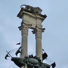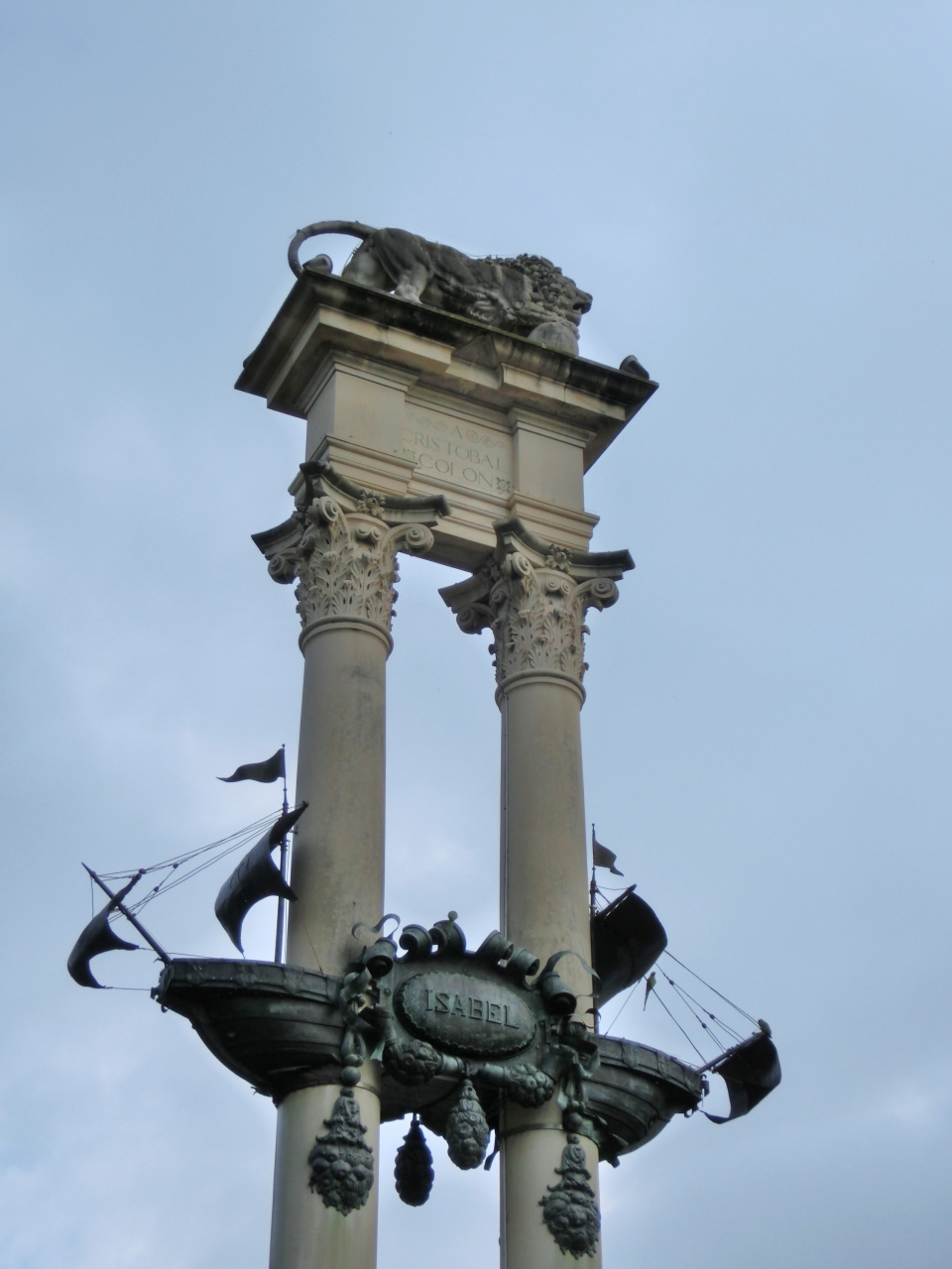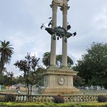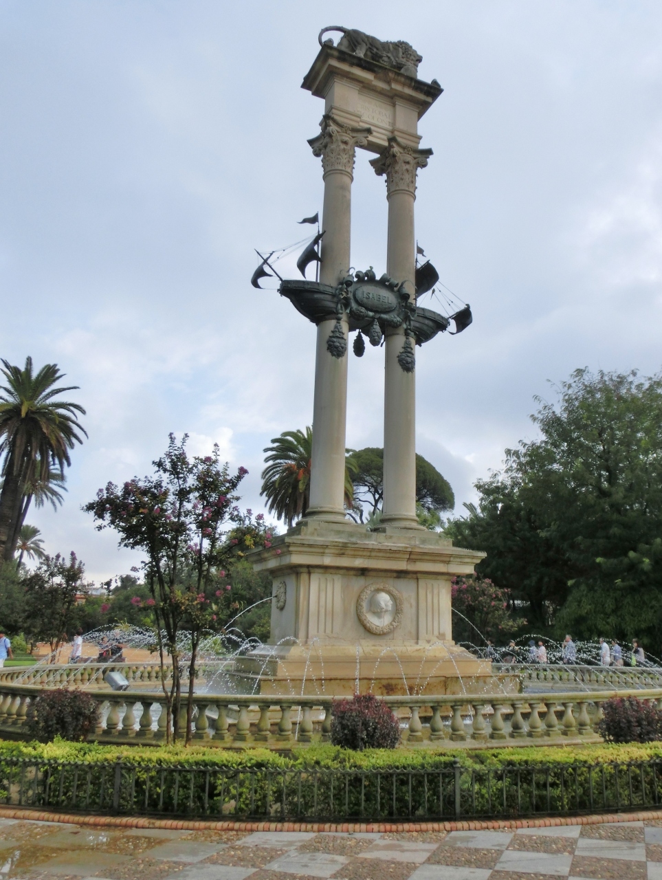 庭園に入ると、この高さ23mのモニュメントが見えてきます。噴水の上にある台座にコロンブスの顔のメダイヨン、柱の中ほどにカトリック両王フェルナンドとイサベルの名前が書かれたカルトゥーシュで装飾されたカラベル船、てっぺんにはスペイン帝国の力を象徴する爪を持ったライオンがいます。ライオンの下にコロンブスの名前、そしてカトリック両王がレコンキスタを終わらせた年=コロンブスがアメリカを発見した年=1492が刻まれていました。
