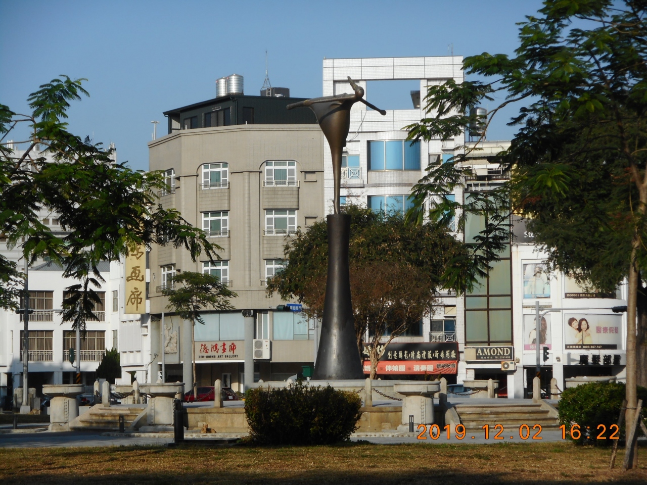 台南の市街観光で立ち寄りました。分かり易い場所です。台鉄台南駅から中山路を道なりに南西に真っすぐ15分程歩くと正面に見えてきます。7本の道路が合流する大きなロータリーの中央が公園になっています。公園内には少女がスケートで片足を上げて滑っているような構図の像が目立ってました。