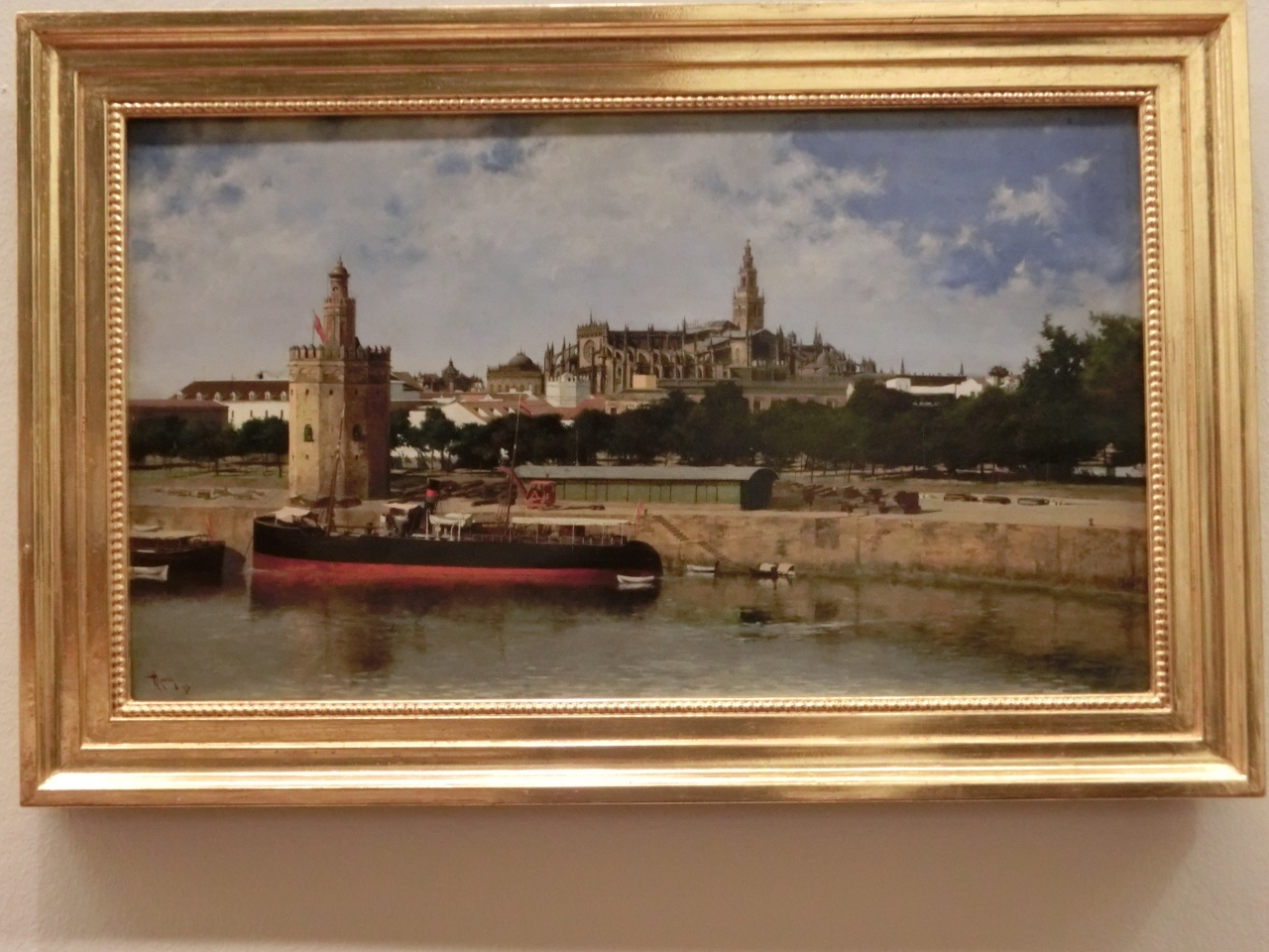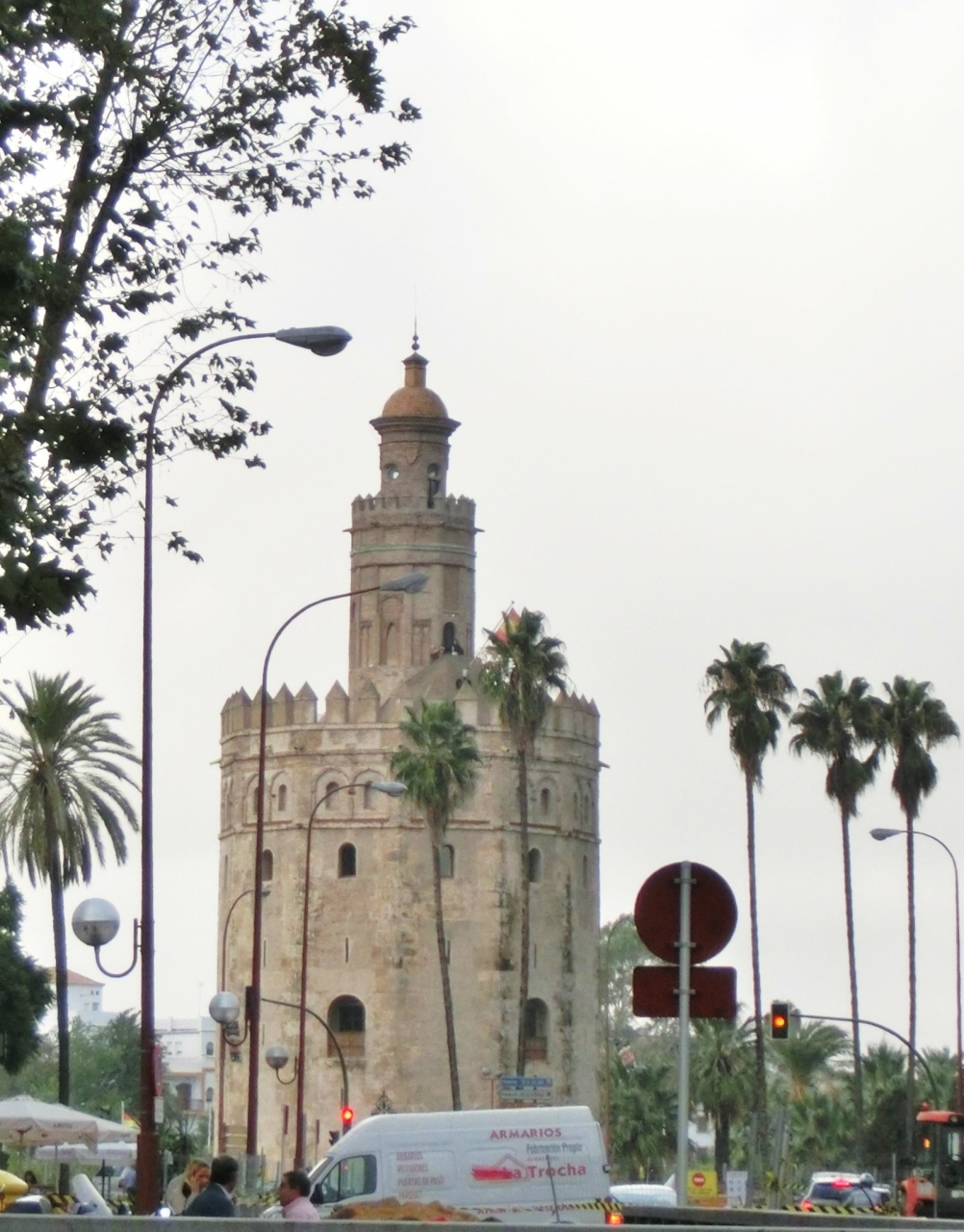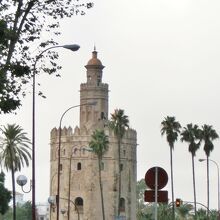 セビリア大学前からプエルタ・デ・ヘレス広場まで歩いてくると、道の向こうに、高さ36メートルの黄金の塔が見えてきました。グアダルキビル川を挟んだ対岸にもかつては銀の塔があり、太い鉄鎖を渡すことで、敵の船の航行を妨害していたそうです。新大陸との貿易時代は、黄金を満載した貿易船がここで荷揚げしていたので、黄金の塔と呼ばれたのかもしれません。リスボン地震後に追加で建てられた上部の金色ドームの円筒形の建物は、今は海事博物館として使用されており、かつては見張り塔だっただけに、眺望も楽しめるスポットになっています。