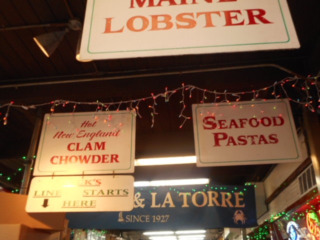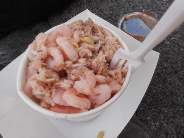 フィシャーマンズワーズの食堂街が並んで或る屋台でも茹でたての蟹やイカなどを食べられます。室内もありますし、屋台ですと立って食べますが、浜風に吹かれて、カモメも寄ってきます。この飲食通りは気軽に食べられて、大勢の観光客で混みあうエリアです。
