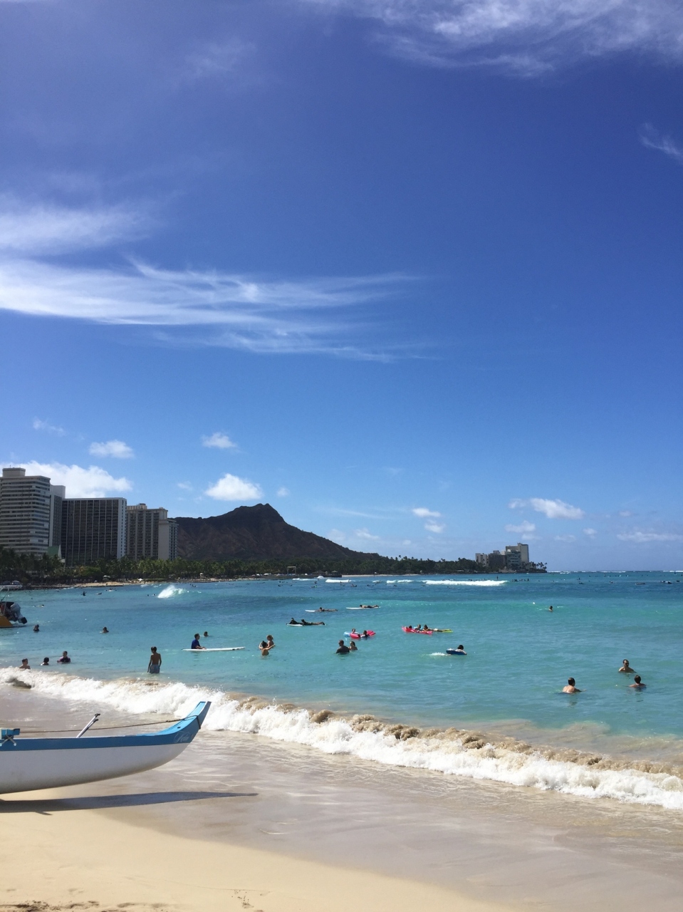ハワイと言えばワイキキビーチ。広い砂浜に寄せる波。ビーチ沿いにはホテルが立ち並び、利用客専用の休憩所や貸しパラソルが並びます。有料のパラソルもありますが、日本と同じく敷物を持参して無料で泳ぐこともできます。ただし、貴重品の管理はしっかりしないといけません。波も強いので子供だけで遊ばせるのは危険です。