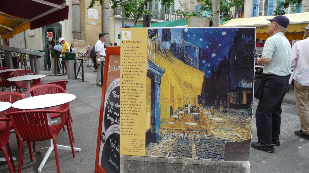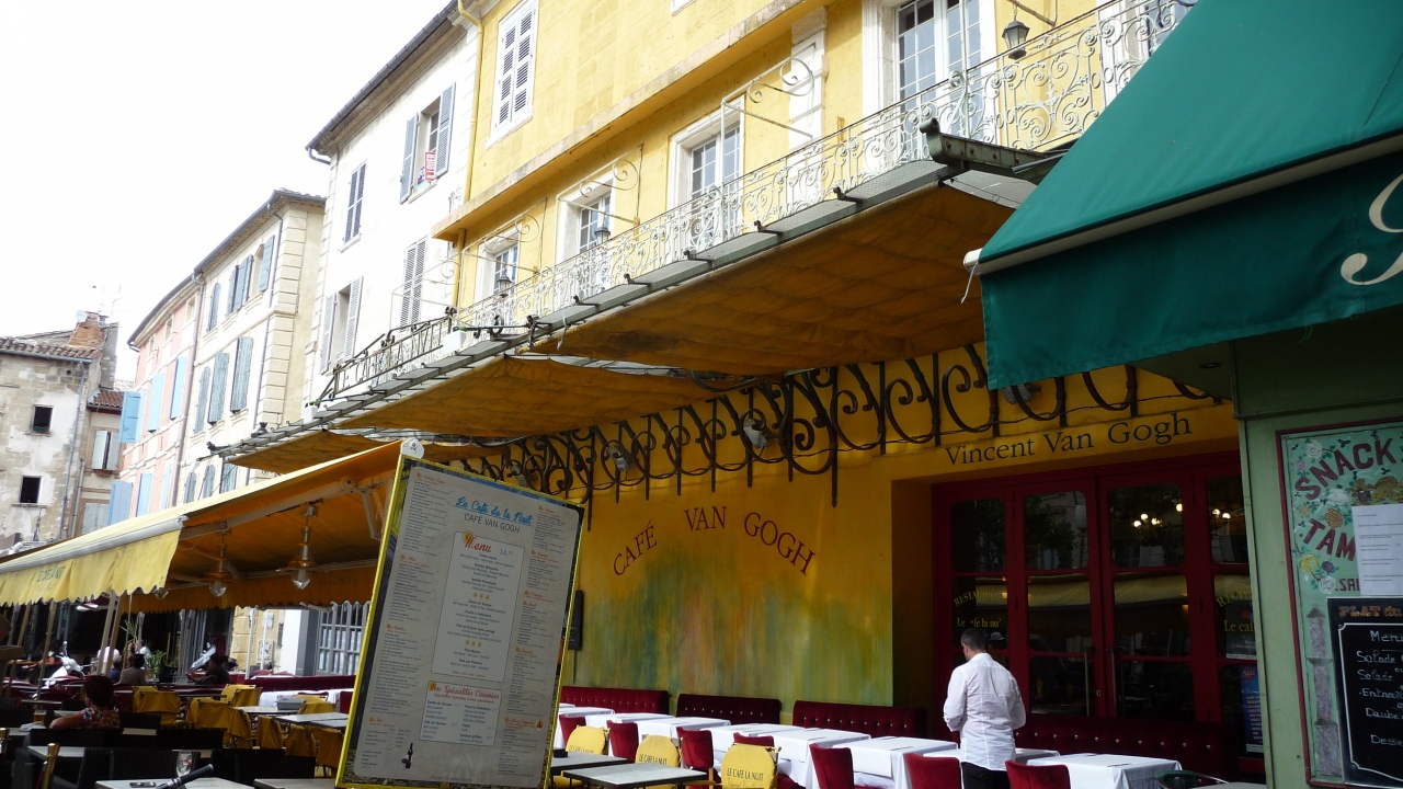 円形闘技場から市庁舎のあるレピュブリック広場へ行く途中に、ゴッホが「夜のカフェテラス」に描いたカフェが当時のままの姿で営業している。フォーラム広場と呼ばれる小さな広場に面した黄色の建物で、壁に CAFE VAN GOGH の文字が見える。オープンテラスに並ぶテーブルや椅子は絵と同じ赤と白、横にゴッホの絵のレプリカが置かれていている。夜に来たら星が見えるかはともかく、絵の雰囲気をより感じることが出来るかもしれない。