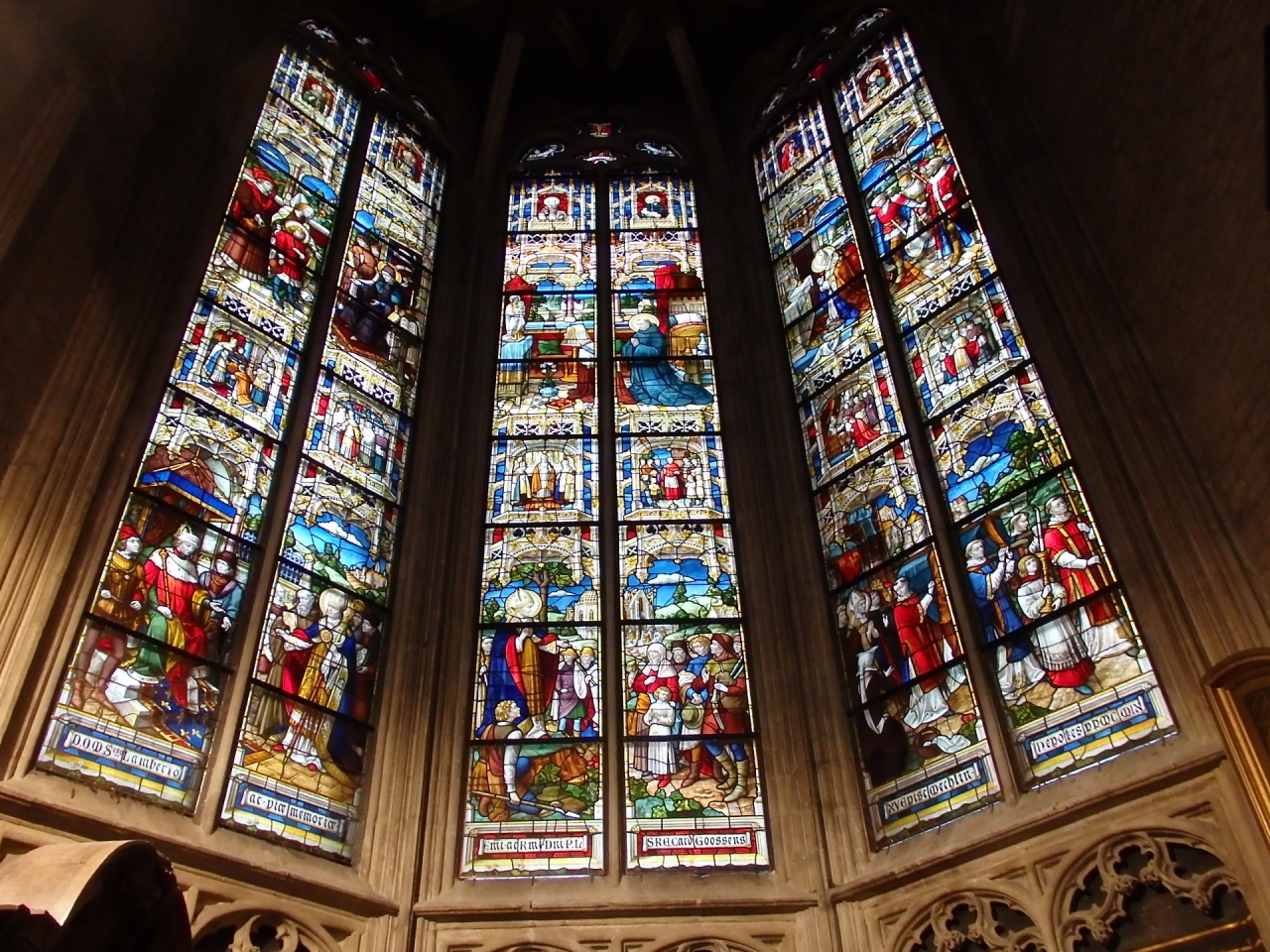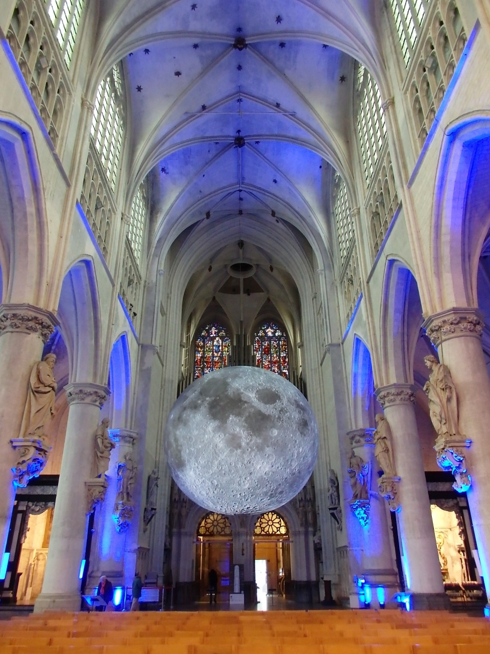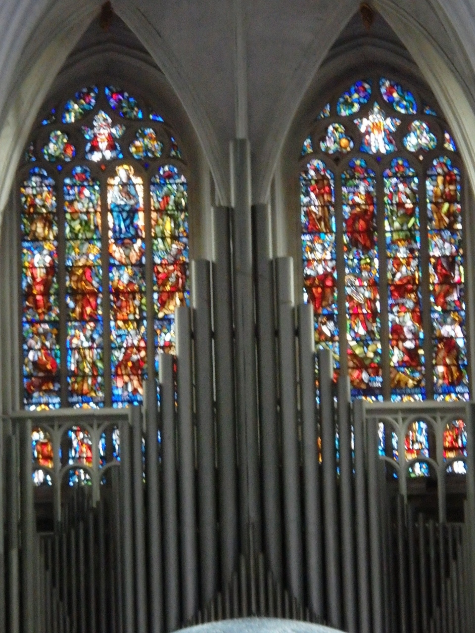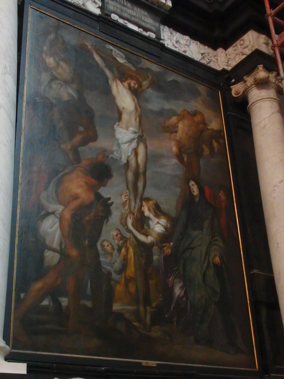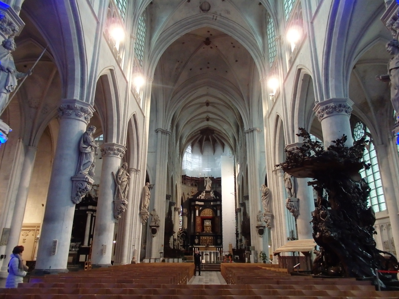 白い列柱のどの柱にも聖人像が施され、美しいステンドグラスや木彫り装飾が見事な説教壇、絵画など見応えがあります。中でもヴァン・ダイクの祭壇画「十字架のキリスト」は見逃せません。