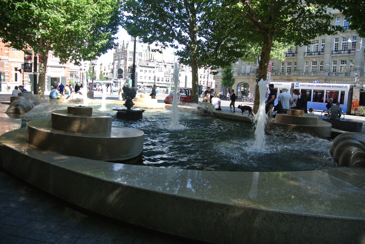 トラムが通り、カフェやファーストフード店なども多い賑やかな場所です。歴史的建造物のカフェアメリカンの前には涼し気な噴水もあって、憩いの場となっていました。運河クルーズの乗り場もあり、国立美術館やゴッホ美術館もすぐという観光の拠点ともなる立地の広場です。