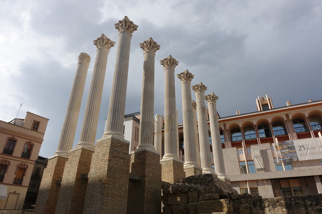 神殿のような円柱が何本もそびえていますが、円柱だけでなく土台部分も含めて新しい感じなので、さすがに復元されたものでしょう。その手前に円柱の一部がごろごろと置かれており、こちらは発掘で出てきた本物ではないかと思われます。東側にはコルドバの街を囲んでいた城壁の遺構も見ることができ、コルドバが歴史ある街であることが改めて分かるスポットでした。