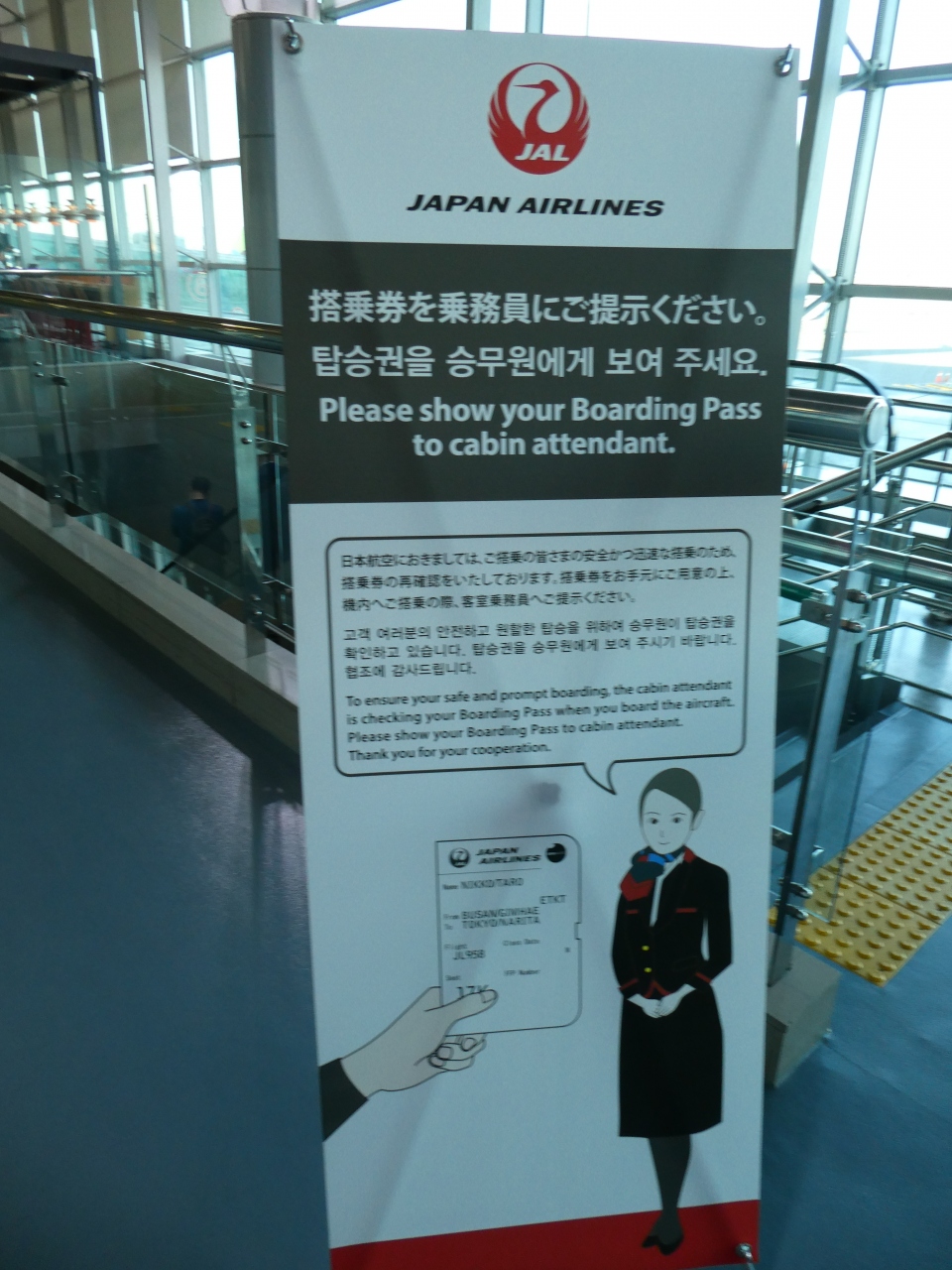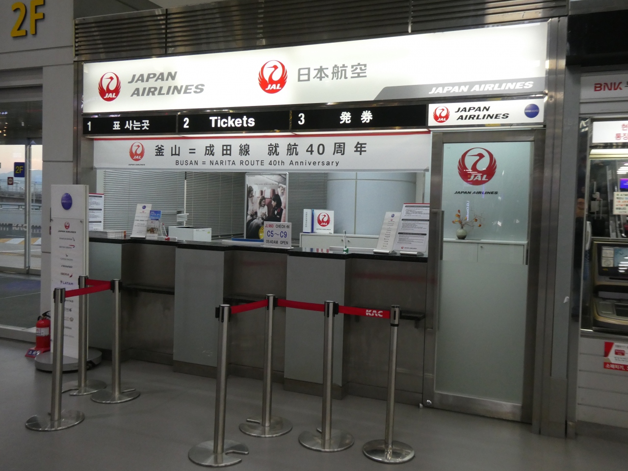 搭乗便はJAL960便 釜山(07:45)⇒東京・成田(09:50)の早朝便でしたがJALのチェックインカウンターはガラガラでJALの発券窓口の支店には「日本航空:釜山=成田 就航40周年!」の横断幕が掲げてありました。