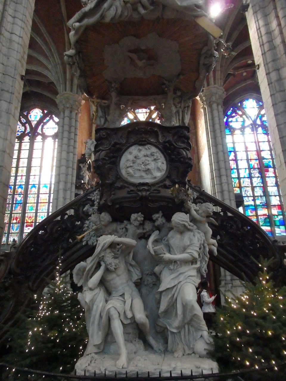 ゲント旧市街の中心地バーフ広場に面して建つ聖バーフ大聖堂は数々の傑作が収蔵されていることで名高い教会です。毛織物商人らによって12世紀に建築が始まり、1569年には塔が完成。ゲントの城壁内で最も古いと言われます。ゲントの至宝とか15世紀フランドル絵画の最高傑作などといわれるヤン・ファン・アイクの「神秘の仔羊」をはじめ、ルーベンスの「聖バーフの修道院入門」、ワッセンボブの「キリスト礫刑」、デルボーの「真理の説教壇」、12世紀のロマネスクの礼拝堂など見逃せない芸術品の宝庫です。残念ながら「神秘の仔羊」が置かれている小部屋内では写真撮影禁止です。