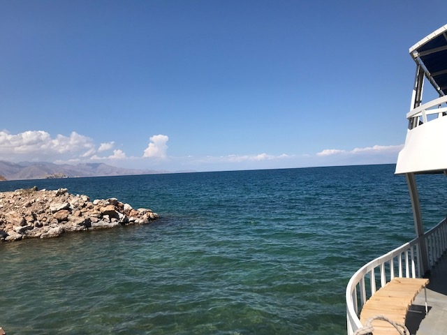 トルコ最大の湖だそうです。湖にはアクダマル島という小さな島があり、聖十字大聖堂 というアルメニア風のキリスト教の教会があります。今回はその聖十字大聖堂 を見に行って来ました。ヴァン市内からミニバスで1時間ほどでフェリー乗り場に着き、そこから25分で島に到着しました。ヴァン湖の水は澄んでいてとても綺麗で、フェリーからは青緑色に見えました。