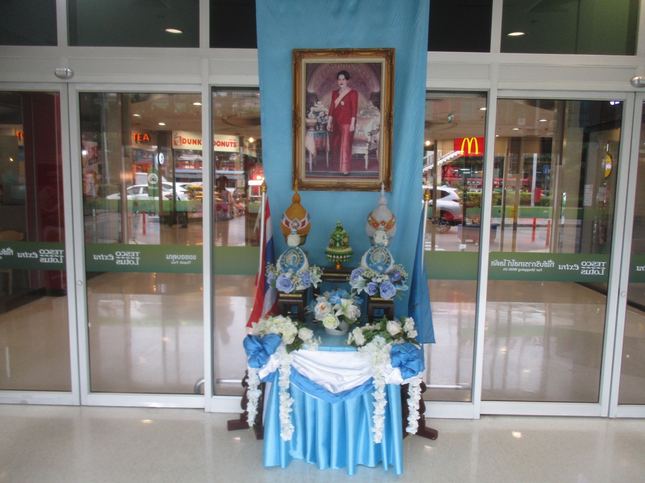 金曜日生まれのシリキット王妃様のシンボルカラーである水色が街中にあふれます。国民も水色のポロシャツを着て王妃様の生誕日をお祝いしていました。青系の服、アクセサリーを身に着けることから、テスコ ロータス1階の専門店ではブルー系のファッションが多く販売されていました。また、2階のスーパーでは関連セールを行っていました。