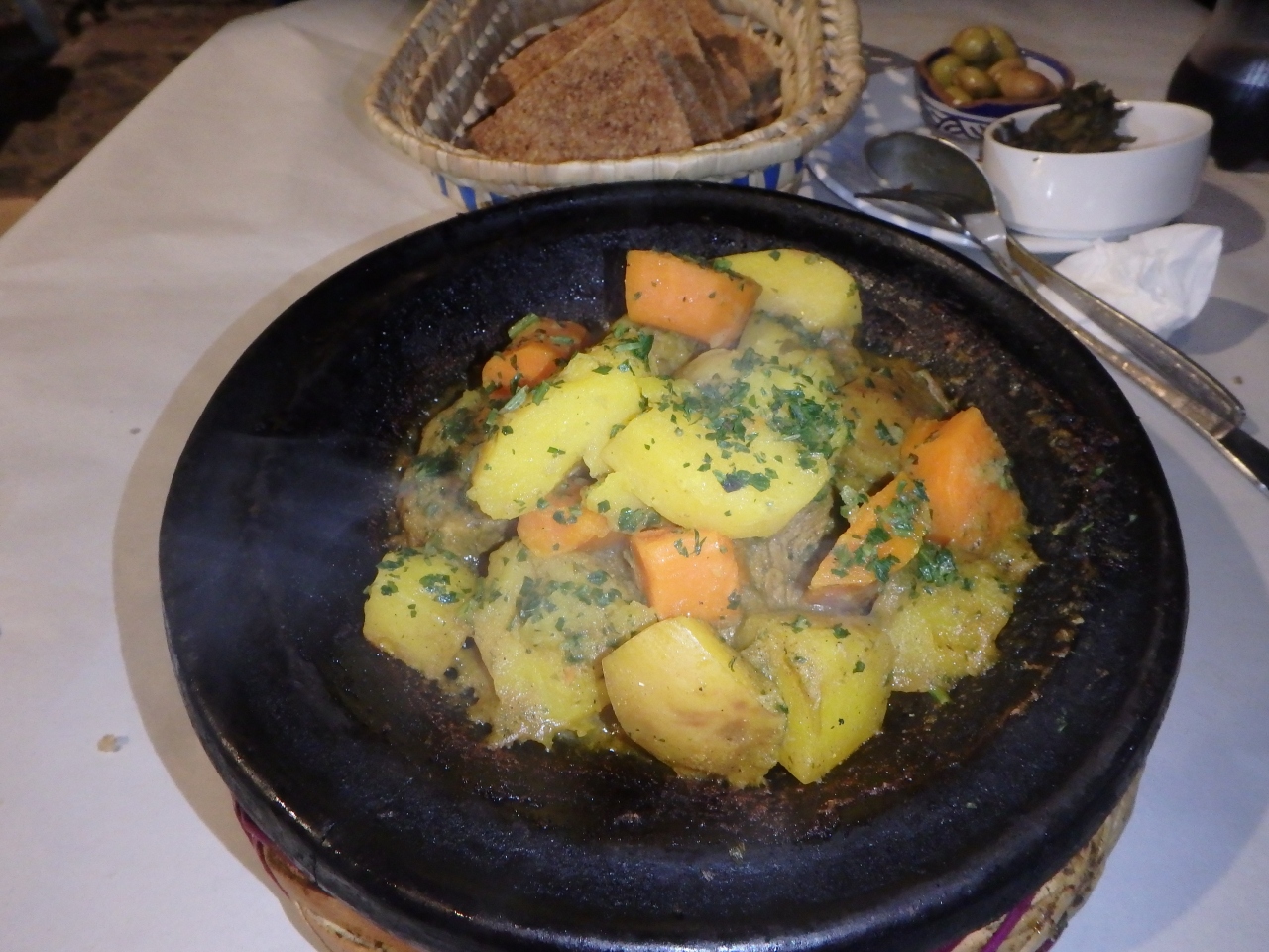 シャウエンの中心部のカスバ(城塞)の前にあるハマム広場に面していてこのレストランがあります。ここで牛肉とジャガイモ、ニンジンが入ったミートタジン(53ディルハム=約600円)を食べました。牛肉とジャガイモ、ニンジンが入っていたので、肉じゃがとほとんど同じでした。