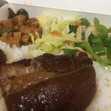 イートインをすると、お弁当を食べながらスープも飲み放題です。スープは、鶏の骨からダシがとれていて、塩のみの味で、すごいちょっとだけにんじんとコーンが入ってておいしかったです。メインのお肉はトロトロでした。