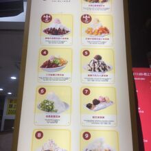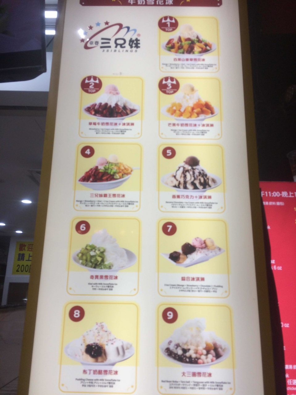 三兄妹は西門町にあります。かき氷のお店で、いろんなトッピングがあります。ちゃんとベスト9が写真付きで貼られています。台湾といえばマンゴーかき氷が有名ですが、タロイモやキウイがのっているかき氷もありました。