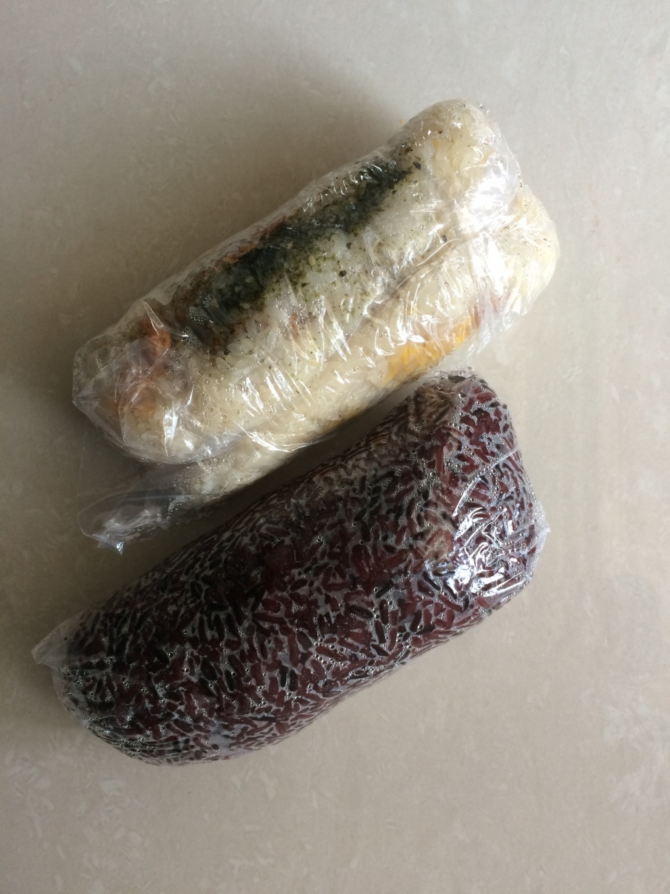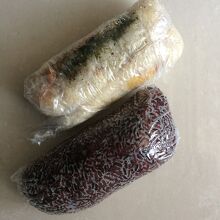 サランラップとはちょっと違うプラスチックに巻かれたおにぎりのお店です。おにぎりが、三角形ではなく、長細い俵のような形でした。お米には白い米のと紫米といわれている種類の米と2種類ありました。紫米のほうが高めです