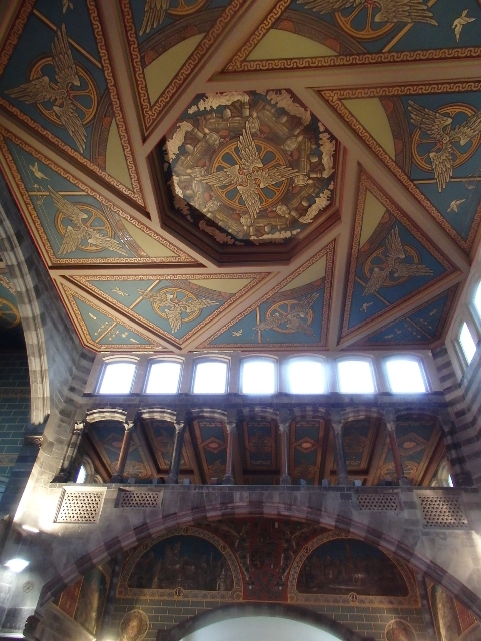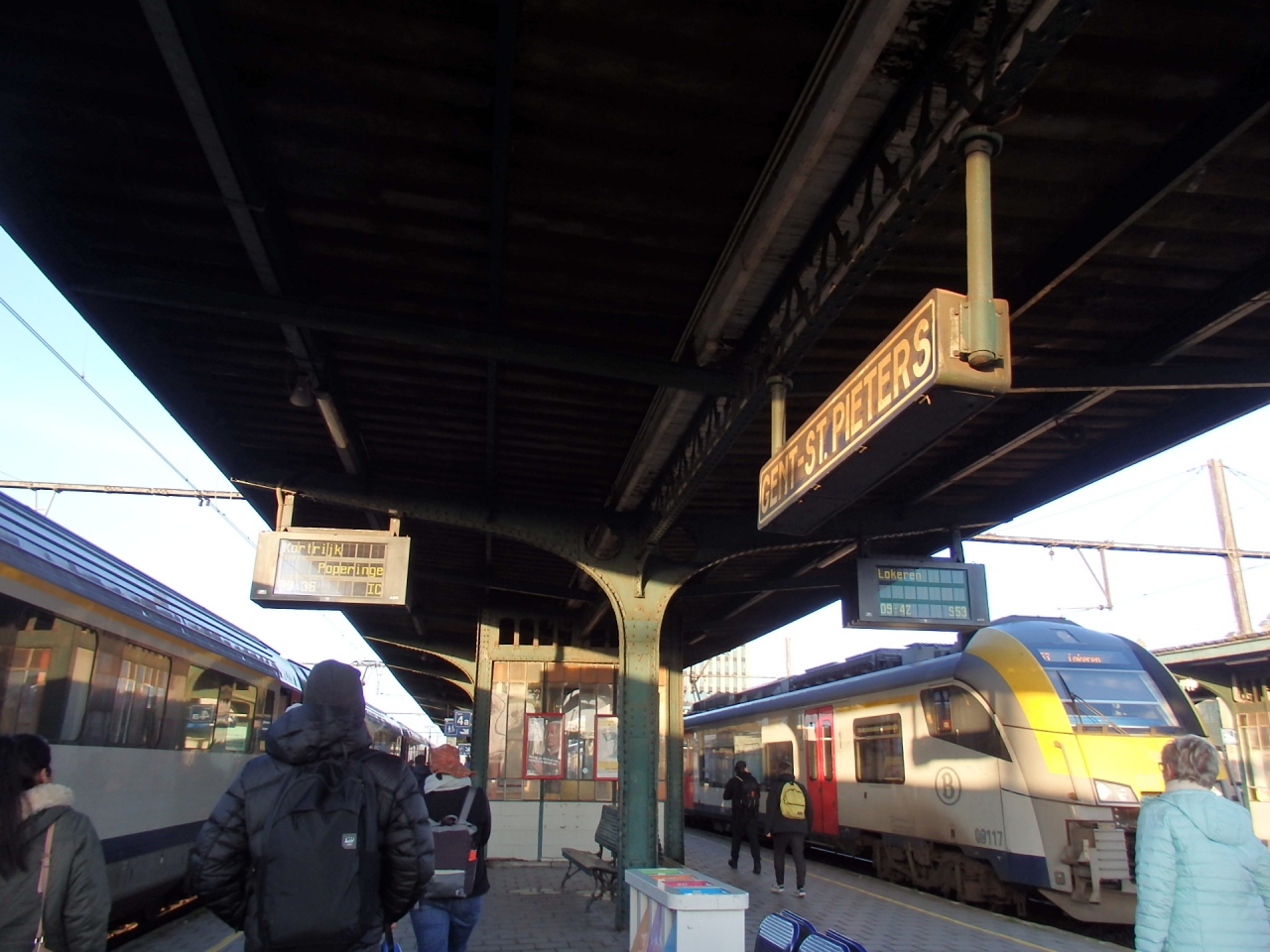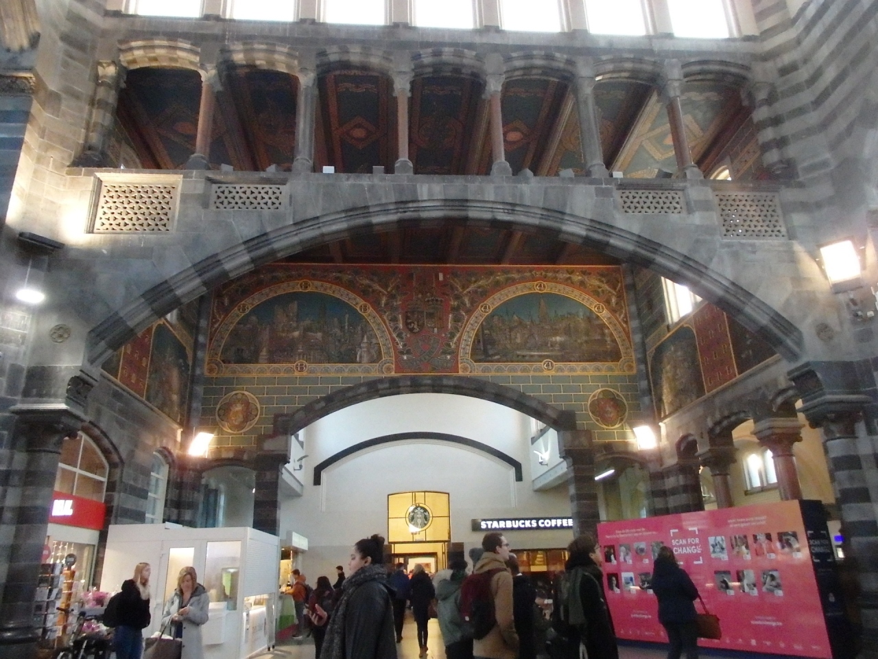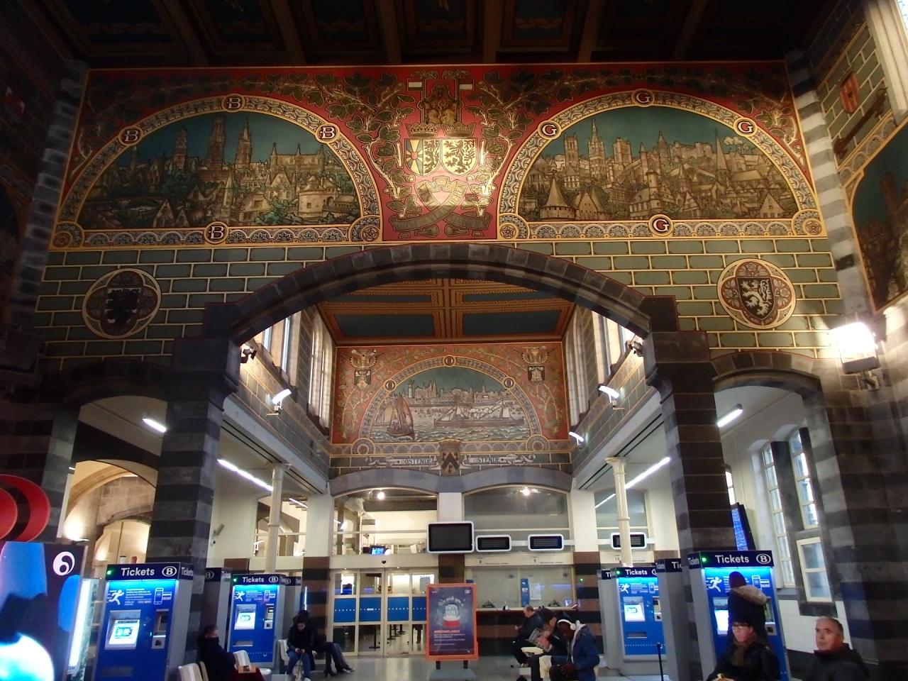 ゲントにはかつて1837年に建てられた南駅(Station Gent-Zuid)という主要駅があり、このセント・ピータース駅が新設されたのは1881年。1913年のゲント万博を機に改築が行われ、現在はゲントの主たる玄関口となっており、素晴らしい壁画を見ることができます。立派な石造りで、コンコースの上の方の壁と天井はカラフルかつ落ち着いた色彩の壁画で埋め尽くされています。現在のものは2010年に修復されたものです。