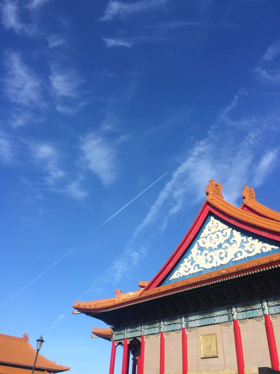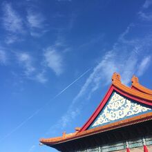 中正紀念堂駅をおりて中正紀念公園の中を歩いて行くと出てきました。真っ赤な御殿です。背景の青空に映えます。全体的に中華な雰囲気でした。左手が音楽ホールで右手にあるほうが劇場ですが、外観の差はないように見えます。