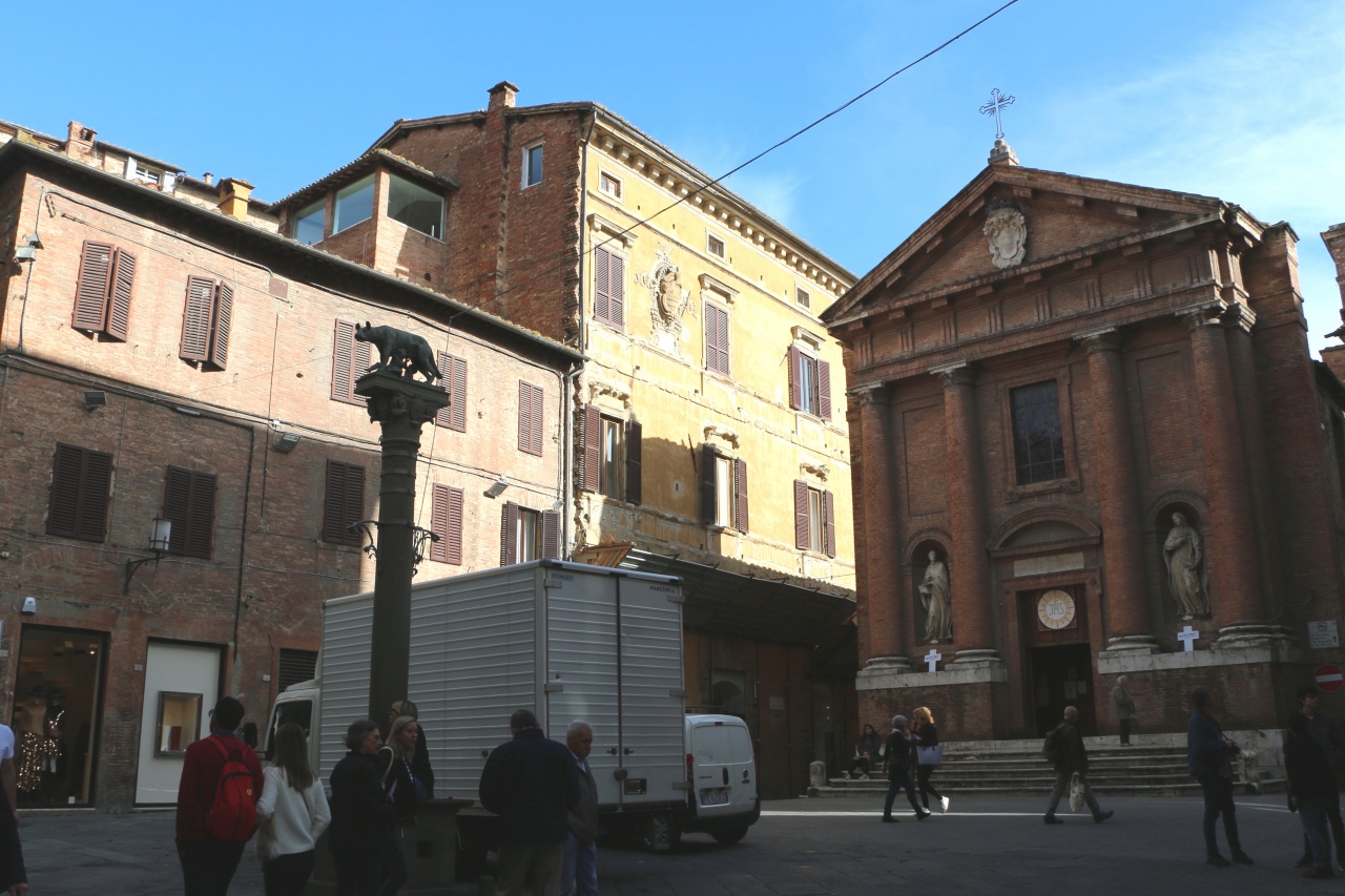 教会前のトロメイ広場にはシエナのシンボルである「雌狼の乳を飲む双子」の像が円柱の上に飾られていますので是非ご注目下さい。
