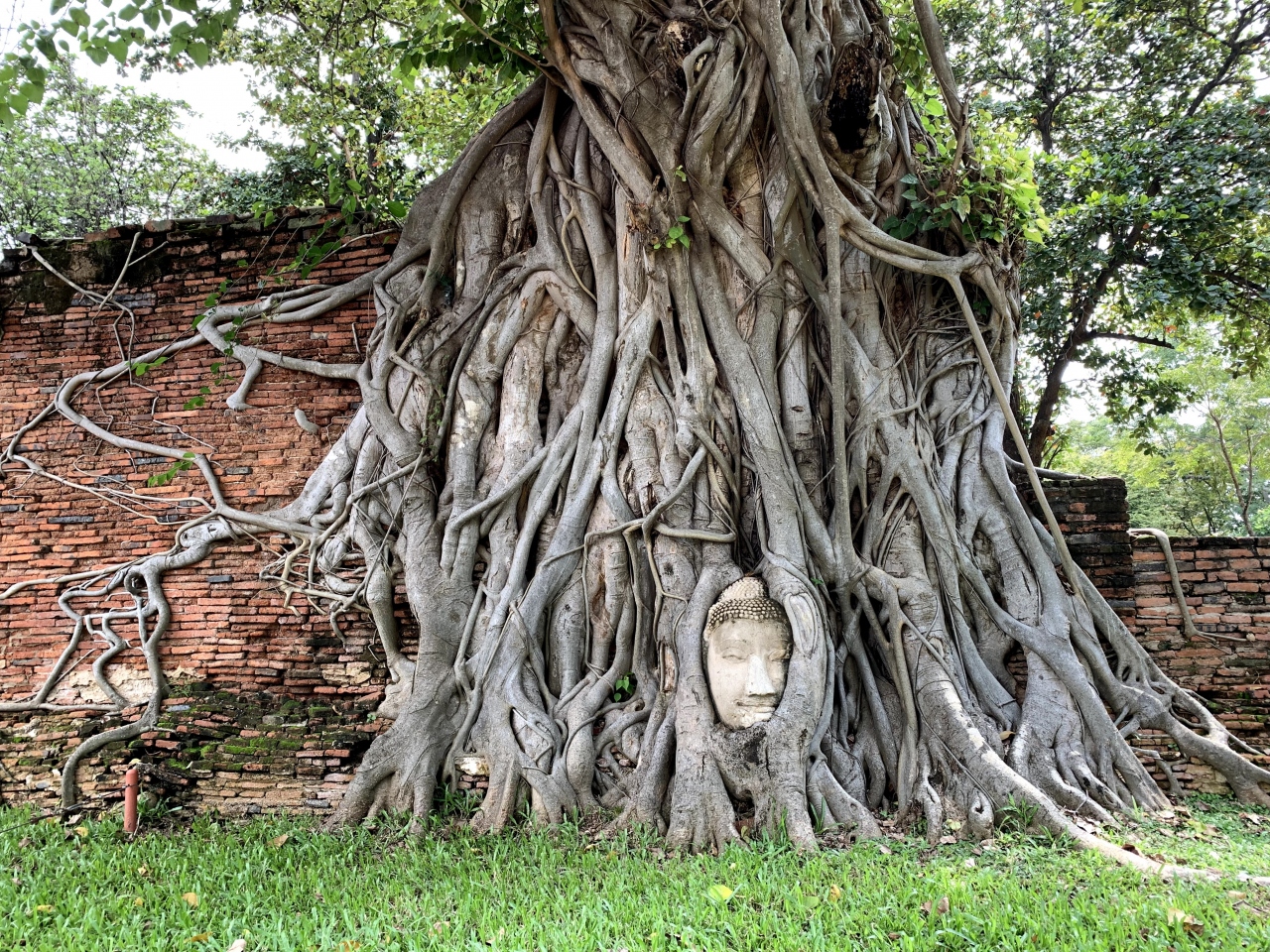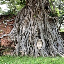 アユタヤで有名な木の根に飲まれた仏頭です。遺跡の壁に木の根が張っており、それだけでもすごい迫力ですが、仏頭の微笑みがまた神秘的な雰囲気を醸し出しています。現在は保存のためすぐ近くには立てないようにロープが貼られています。