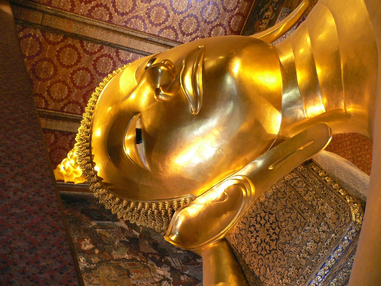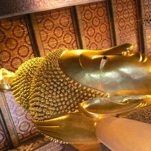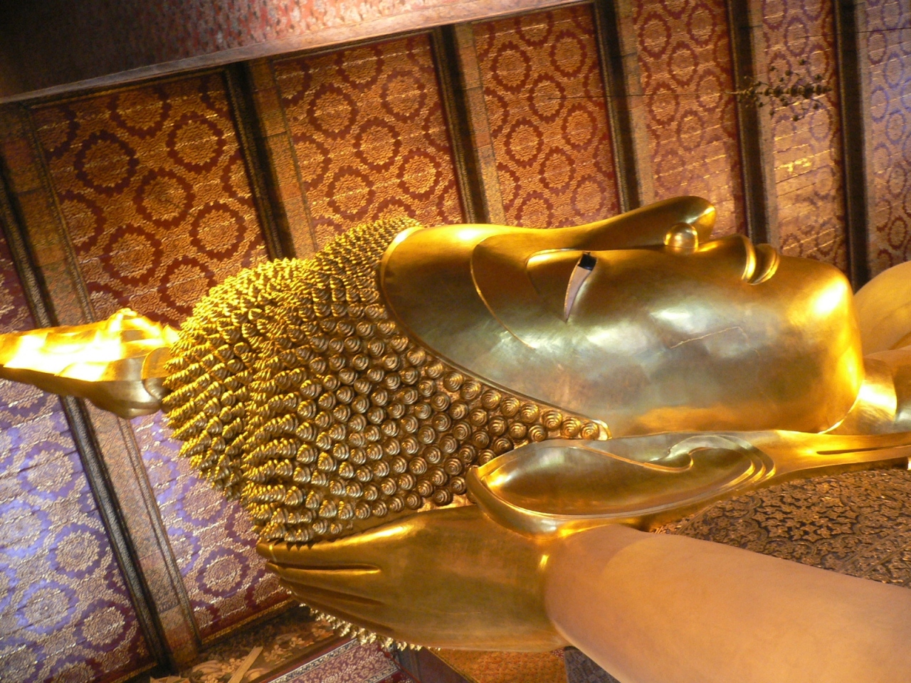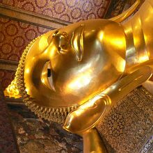 ”ワット・ポー”は別名、涅槃寺と言うそうで、その堂内に黄金の釈迦像が仏堂に横たわっていました。なんと、全長46メートルだそうで、金色に輝く、その横たわる大きさにびっくりしました。全身を金箔で覆い、つやつやと光り輝いていました。