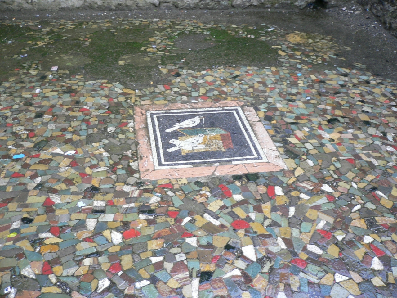 ポンペイの一般的な邸宅だったそうで、ポンペイでは普通の市民の住まいで、玄関の床にタイルが残っていて、鎖でつながれている犬のモザイク画があり、猛犬に注意の注意書きがありました。客間に悲劇詩人のモザイク画が在りました。