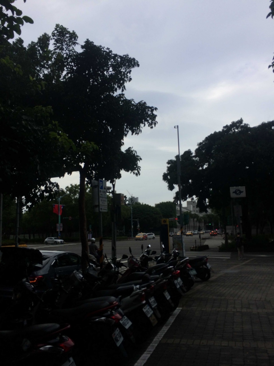 台湾のわりに街路樹が比較的緑色が綺麗な樹木でした。政府の建物や公的機関がおおく並んでいる通りでした。学校などはなく、子供達なども見かけませんでした。バイクを無料で停めれるスペースが道路にあって、便利そうでした
