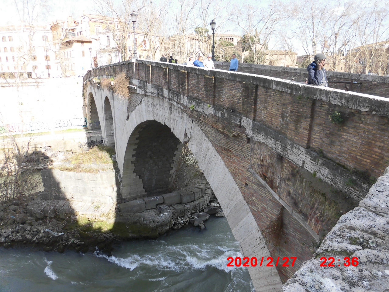 イタリアのローマ観光で立ち寄りました。パラティーノ橋から有名な壊れた橋であるロット橋を見学後、テベレ川の西岸を北に少し行くと中州の様なティベリナ島を挟んで2つ橋がありました。南側の橋がチェスティオ橋で、北側の橋がファブリキウス橋でした。チェスティオ橋と比べるとレンガ色が目立ってました。