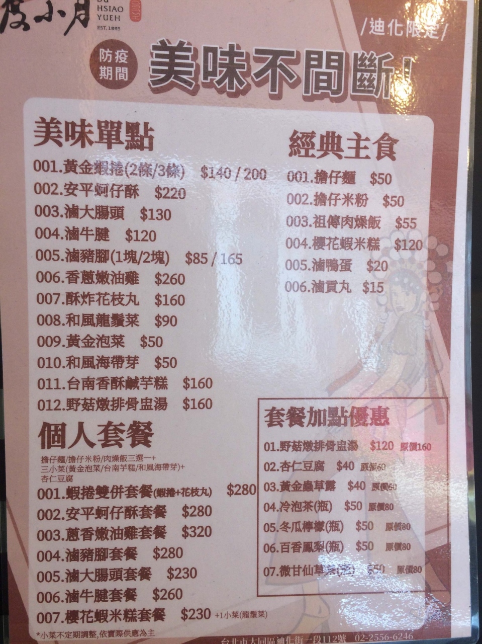 迪化街一段にある度小月の店舗は、レトロな建物が並んだ通りに建っているので他のところよりも格式が高い気になりました。メニューは300元代でセットが提供されます。麺はすごく小さいので、セットがおすすめです。