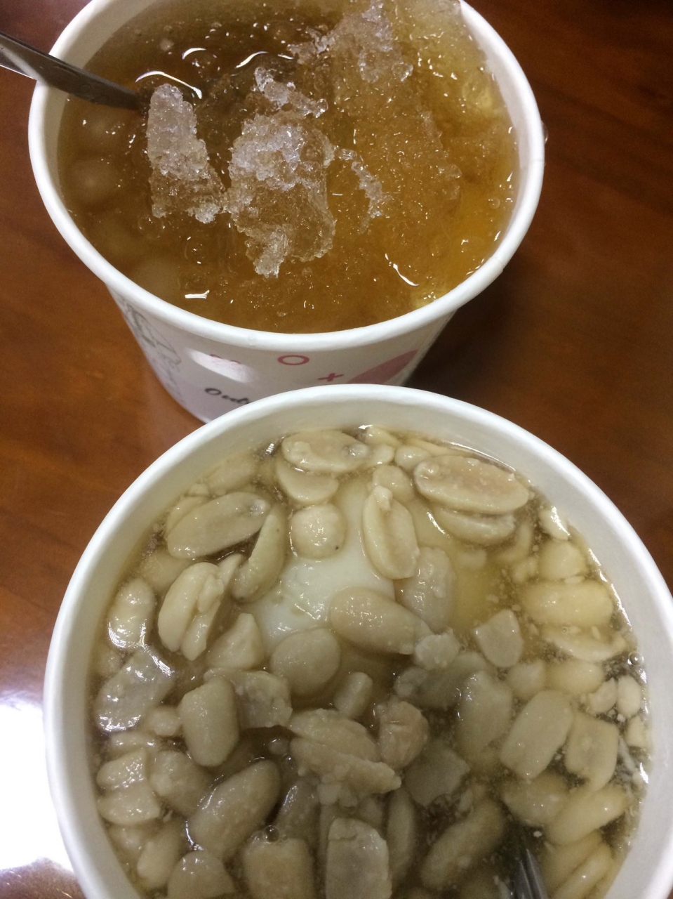 前はもっと試食などもあり、活気があった気がしました。屋台がやっていないところもあったせいか、屋台の間隔もきもち少しあいていました。豆花のお店があり、そこでピーナッツ豆花と粉圓豆花というのを食べてみました。