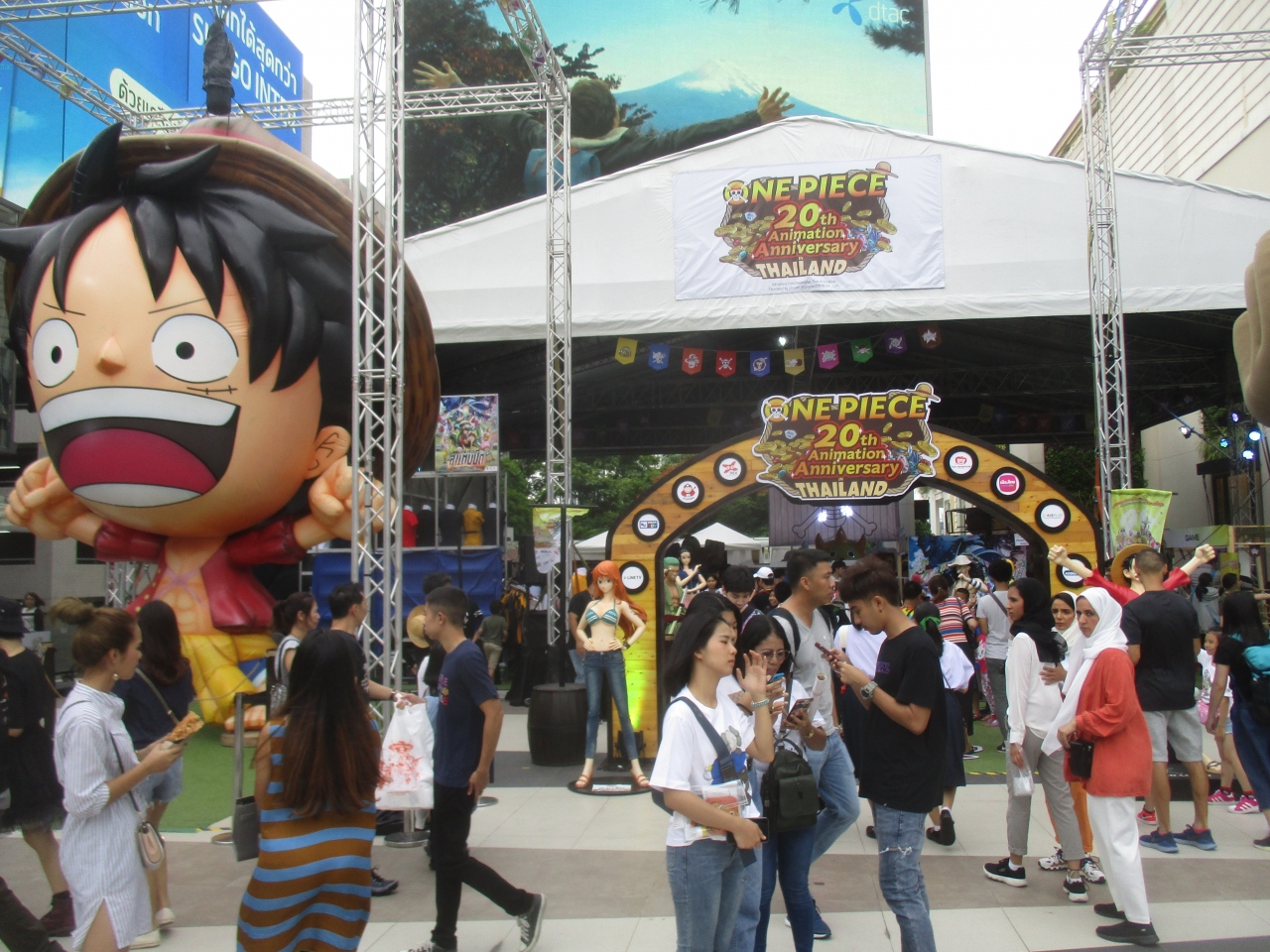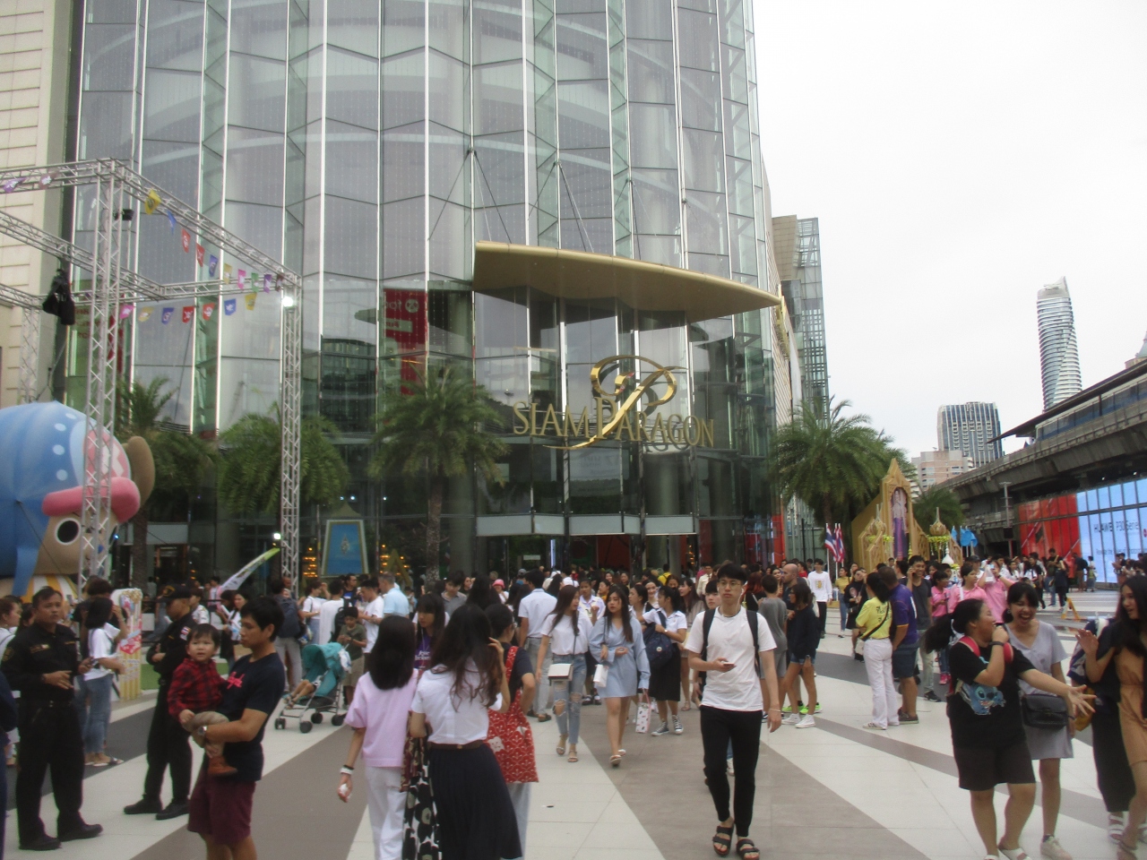 サイアム パラゴンの屋外スペースでワンピースのキャラクターグッズ販売イベントが開催されていました。キャラクターとの写真撮影などもでき、子供連れの家族や学生が多く盛況でした。日本のアニメ映画やゲームは特に人気があるようで、Tシャツ、カバン、小物など飛ぶように売れていました。