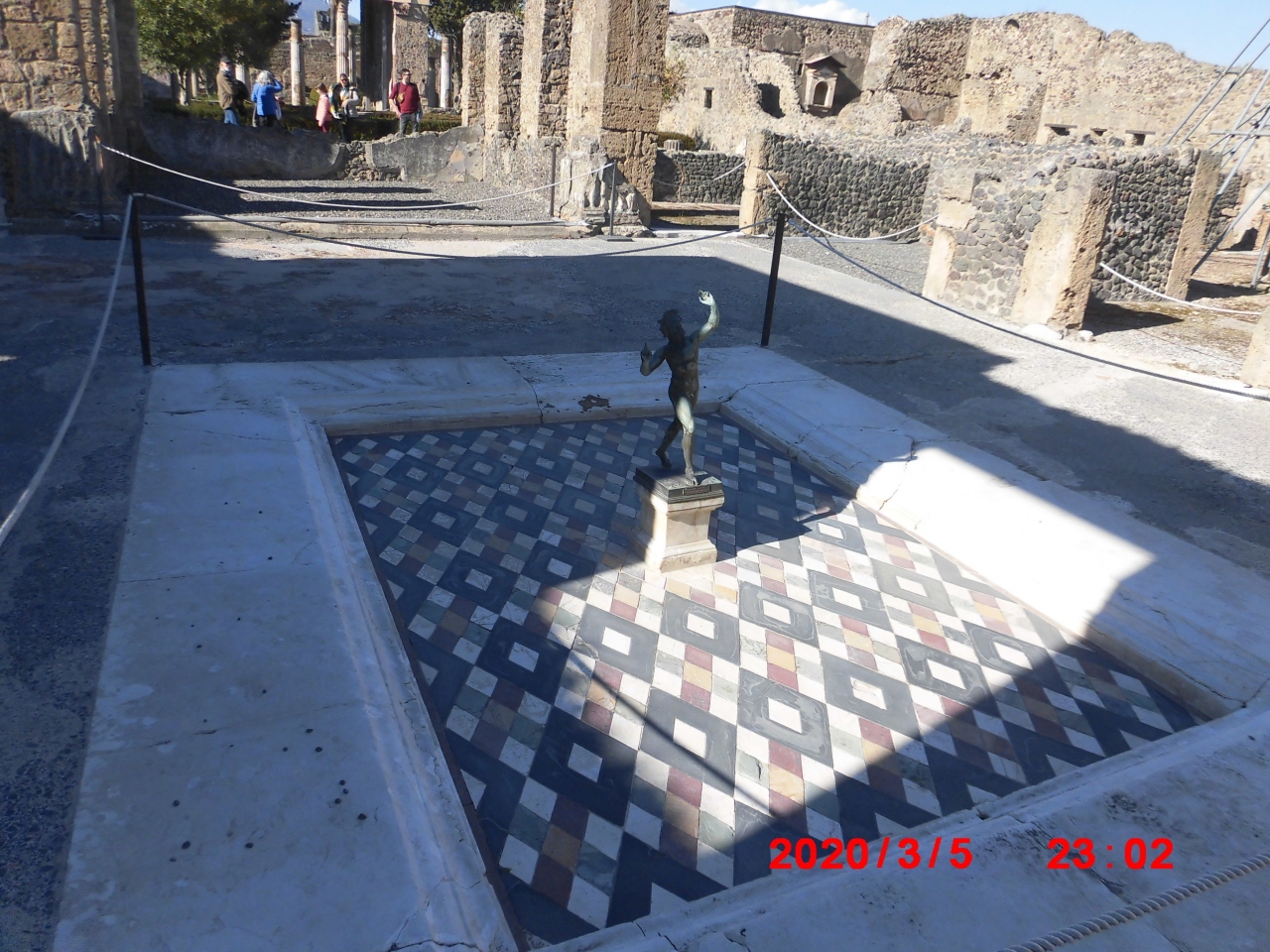 イタリアのナポリのポンペイ観光で立ち寄りました悲劇詩人の家から北東方向に数分で着きました。かなり広い敷地に見えました。「2世紀のローマの豪華な住宅の遺跡で、ファウヌスの銅像のレプリカがあり、モザイクが保存されている」と説明されてました。確かにロープが張られた中に小さな像がありましたが、よくわかりませんでした。