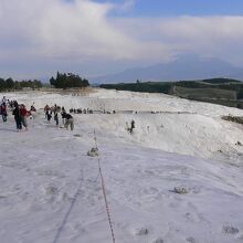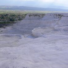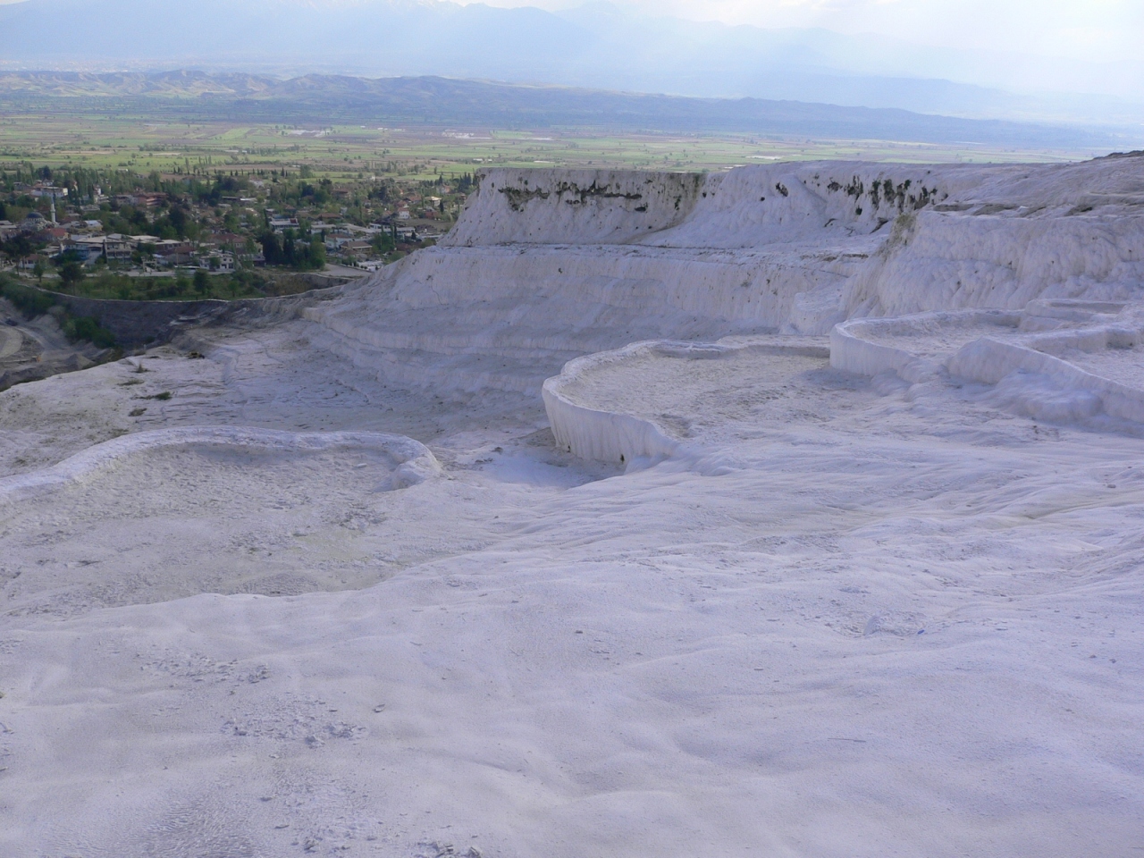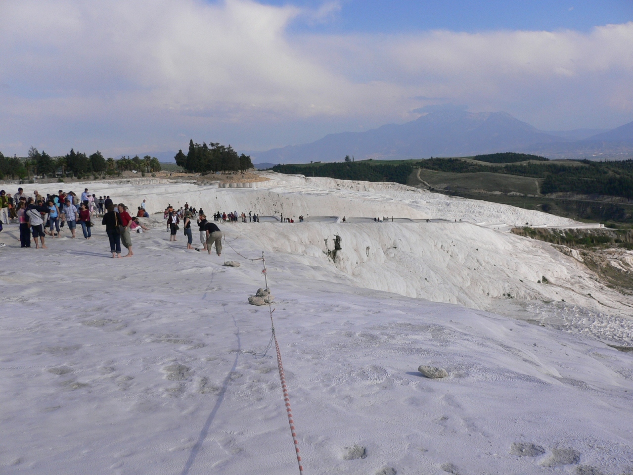 白い炭酸カルシウムの塊が段々畑のように連なる岩棚で、世界遺産にも登録されている鉱泉で、不可思議な光景でした。長い年月をかけて造られた壮大な石灰棚で、リウマチ、神経系、高血圧などにも効能があるそうで、温めのお湯が沸いていました。