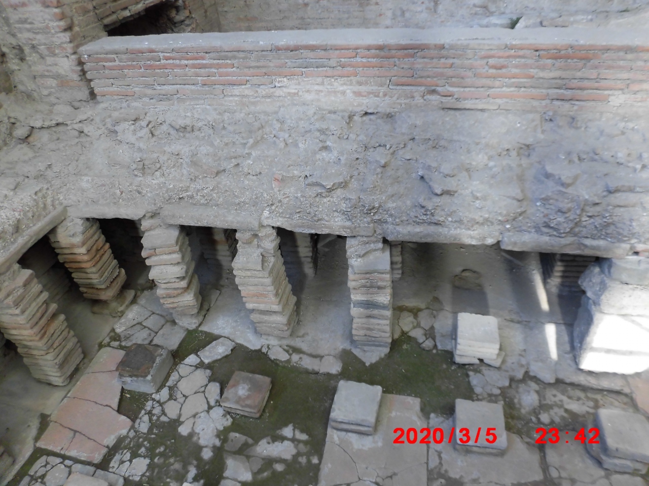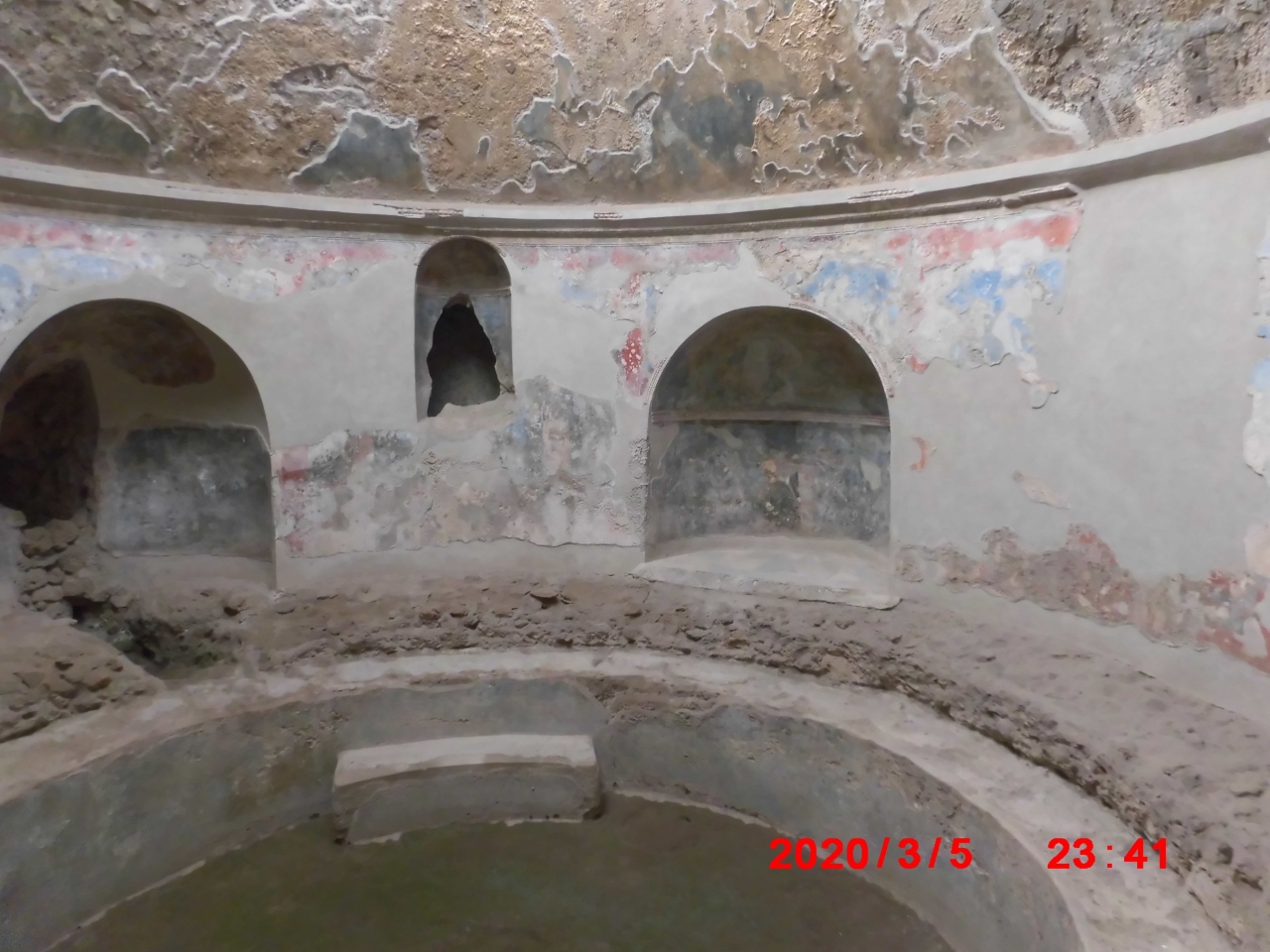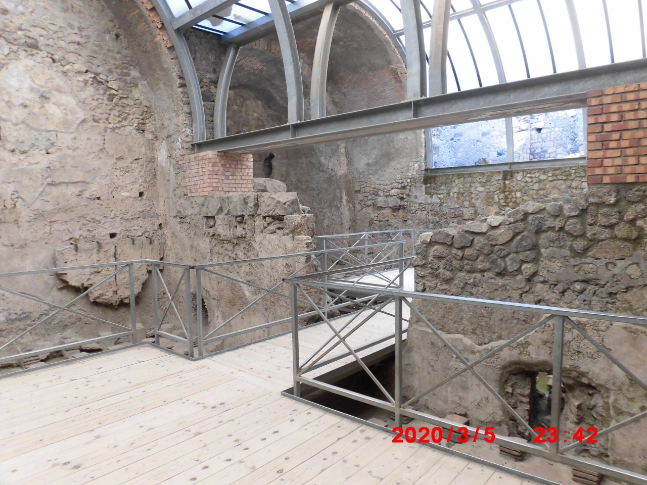 イタリアのナポリのポンペイ観光で立ち寄りました。フォロ(フォーラムアットポンペイ)から数分東にあった浴場跡です。「紀元前2世紀の公衆浴場で、アーチ形の天井が完全に残っており、スタッコ仕上げのレリーフも見られる」と説明されてました。確かに内部は広くアーチ型の天井もありました。