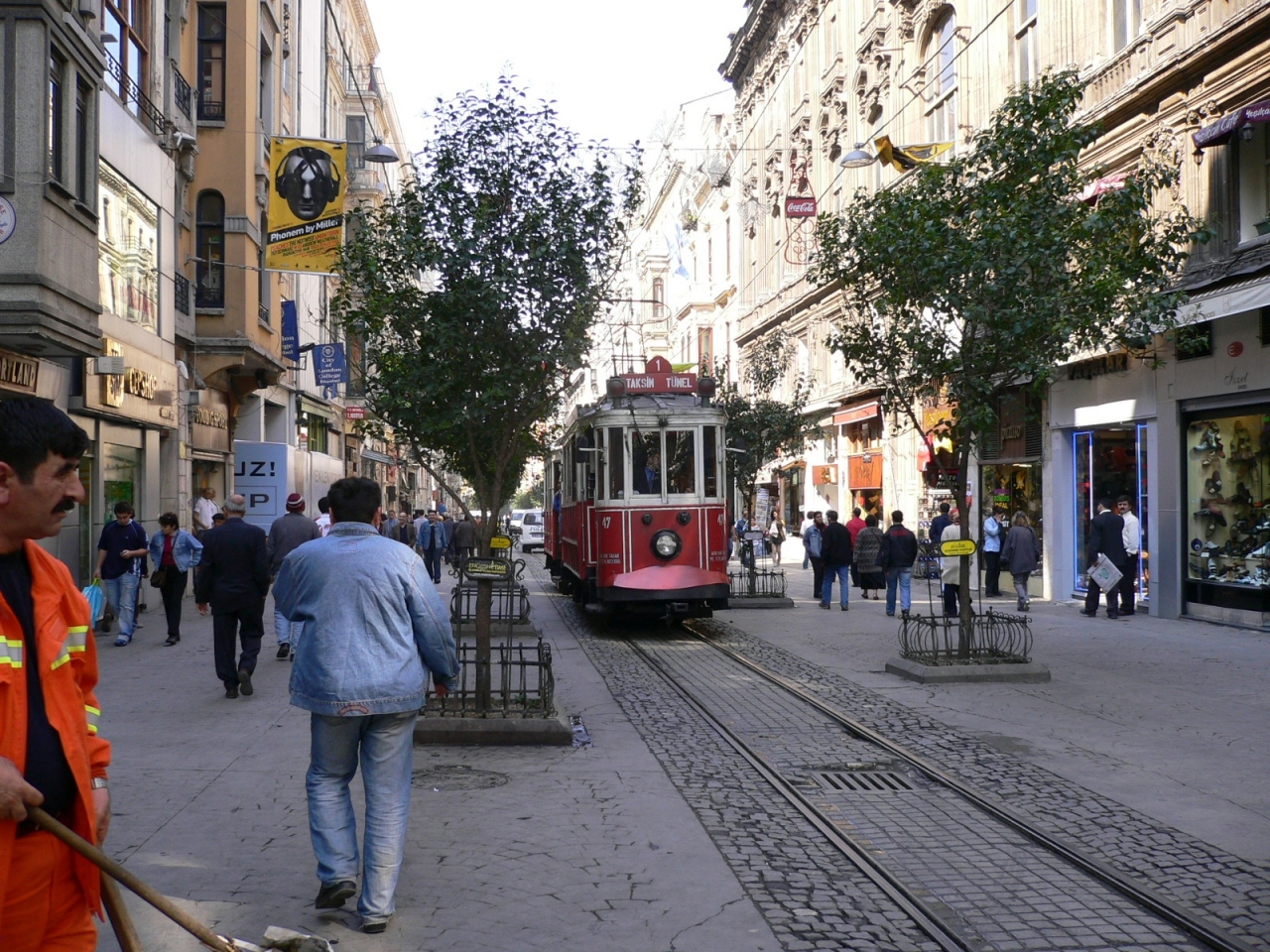 新市街のタクシン広場を起点にしてあるのが、イスティクラーク通りで新市街の中心です。ツァーのホテルや航空会社のオフィス、銀行なども在り、広場から金角湾へ向かって西南に延びています。人出が多く、トラムが走っています。通りの両脇にはレストランやブティックが並んでいました。