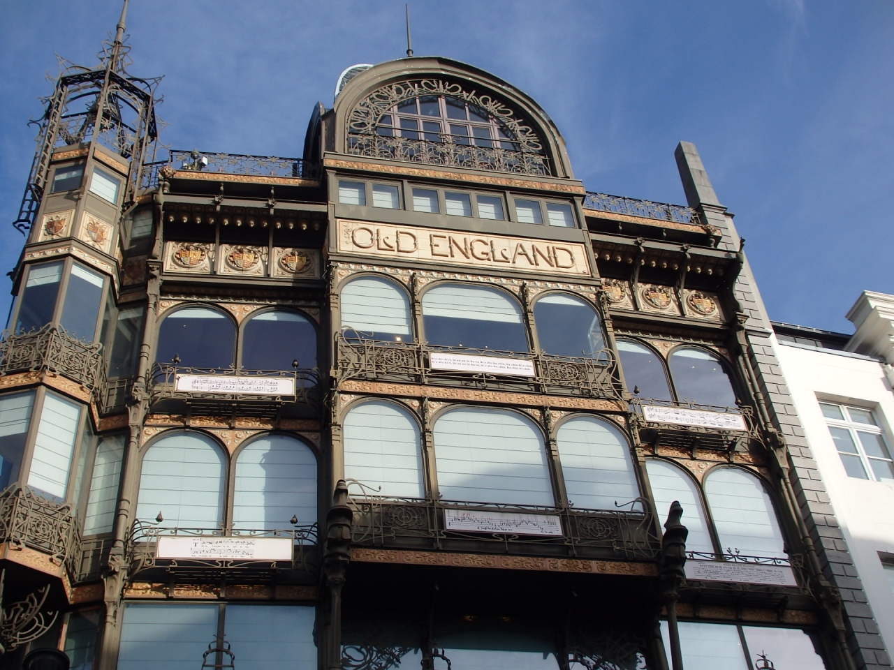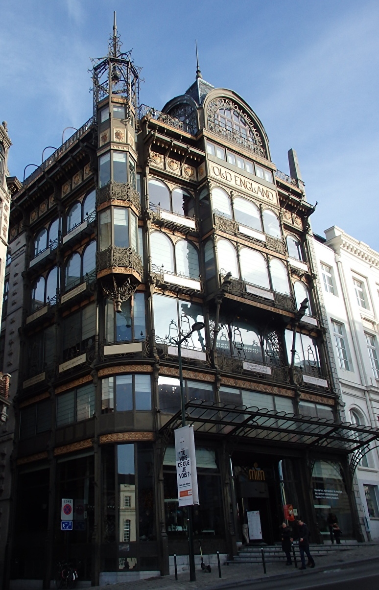 ブリュッセル中央駅からロワイヤル広場へ向かう途中にある芸術の丘そばにあるのが楽器博物館。モン・デ・ザール通り沿いに位置し、1899年完成の鉄とガラスでできた黒っぽいアールヌーヴォーの建物に入っています。もともとイギリスの高級老舗デパートとして建築家サントゥノワが設計したもので、通りに面した正面上部の中央には「Old England」の文字が入っています。