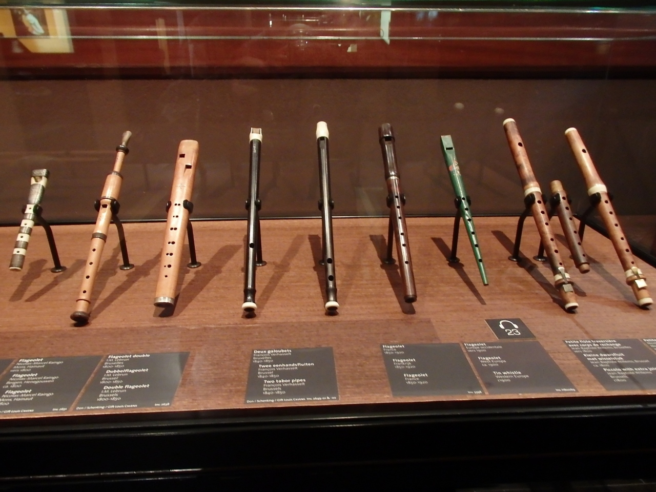 館内では世界中から集められた約1500点の楽器が展示されています。階段やエレベーターでアクセスできる各階によって、テーマごとに分けられた古典楽器の数々や世界各地の民族楽器などを見ることができます。受付で貸してくれるオーディオガイドのヘッドフォンをつけて楽器のそばに近づくとその楽器の音を聞くこともできます。最上階の展望レストランだけ利用する人はチケットなしでもエレベーターでアクセスできるようになっており、お食事だけでも楽しめるところでした。