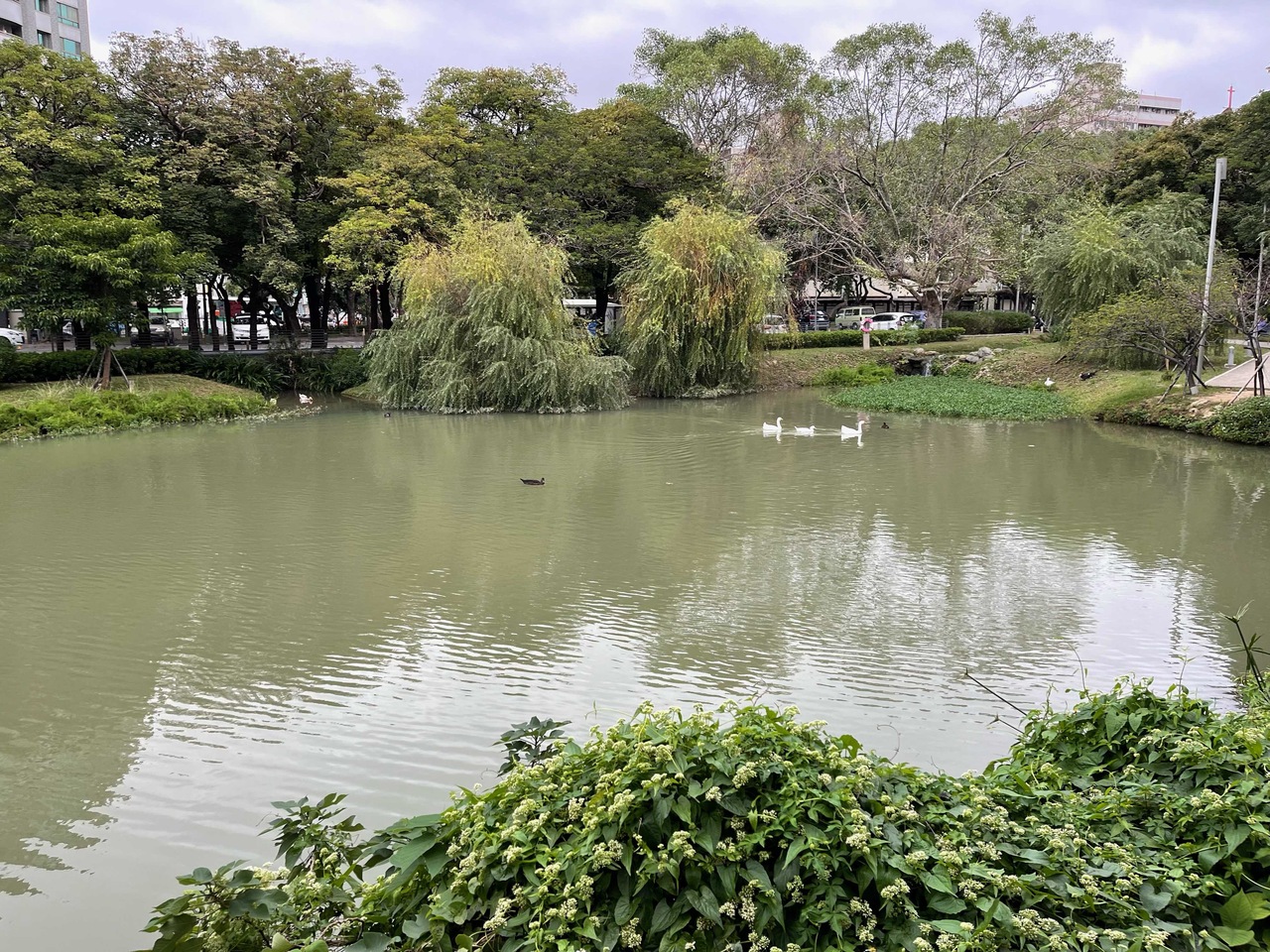 新竹エリアは、日本統治時代にかなり開拓されたエリアなので、公園の中にも日本の家屋がたくさんありました。どれも、今は店舗になっていて、きちんと保存されています。景観も良かったです。かもが池の噴水を楽しんでいました