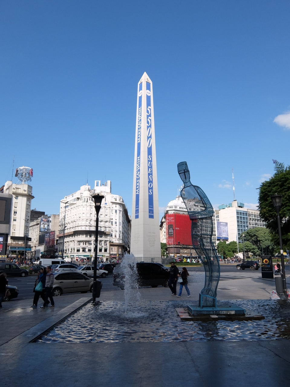 ブエノスアイレスのメインストリート7月9日大通りの中心に建つ真っ白な記念碑です。周囲の広場は、ときには交通を遮断して、各種デモやサッカーの勝利を祝う人たちが集まる場所になります。夜には、アルゼンチンの各種記念日を祝ったり、他国に関する感謝・災害や事故に対する追悼の意を込めて、様々にライトアップされます。