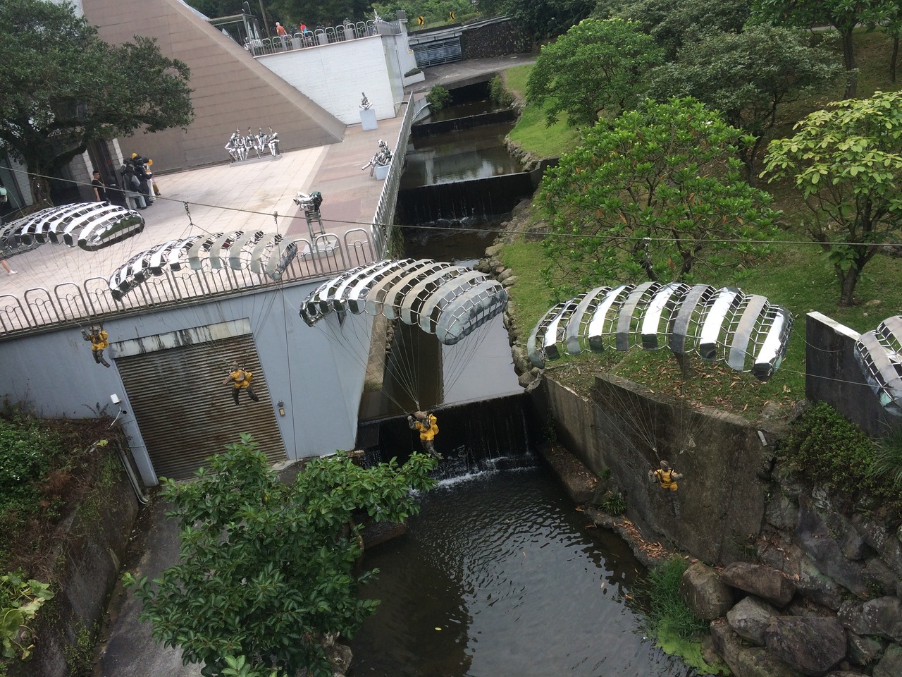 屋外の展示が多く、すべてが雨ざらしでも大丈夫なカッパーを使用した作品です。特に水兵さん達や、パラシュートの展示など、空間を最大限に使った展示が多かったです。ゆっくり、コーヒーなどをもって見学したい場所です