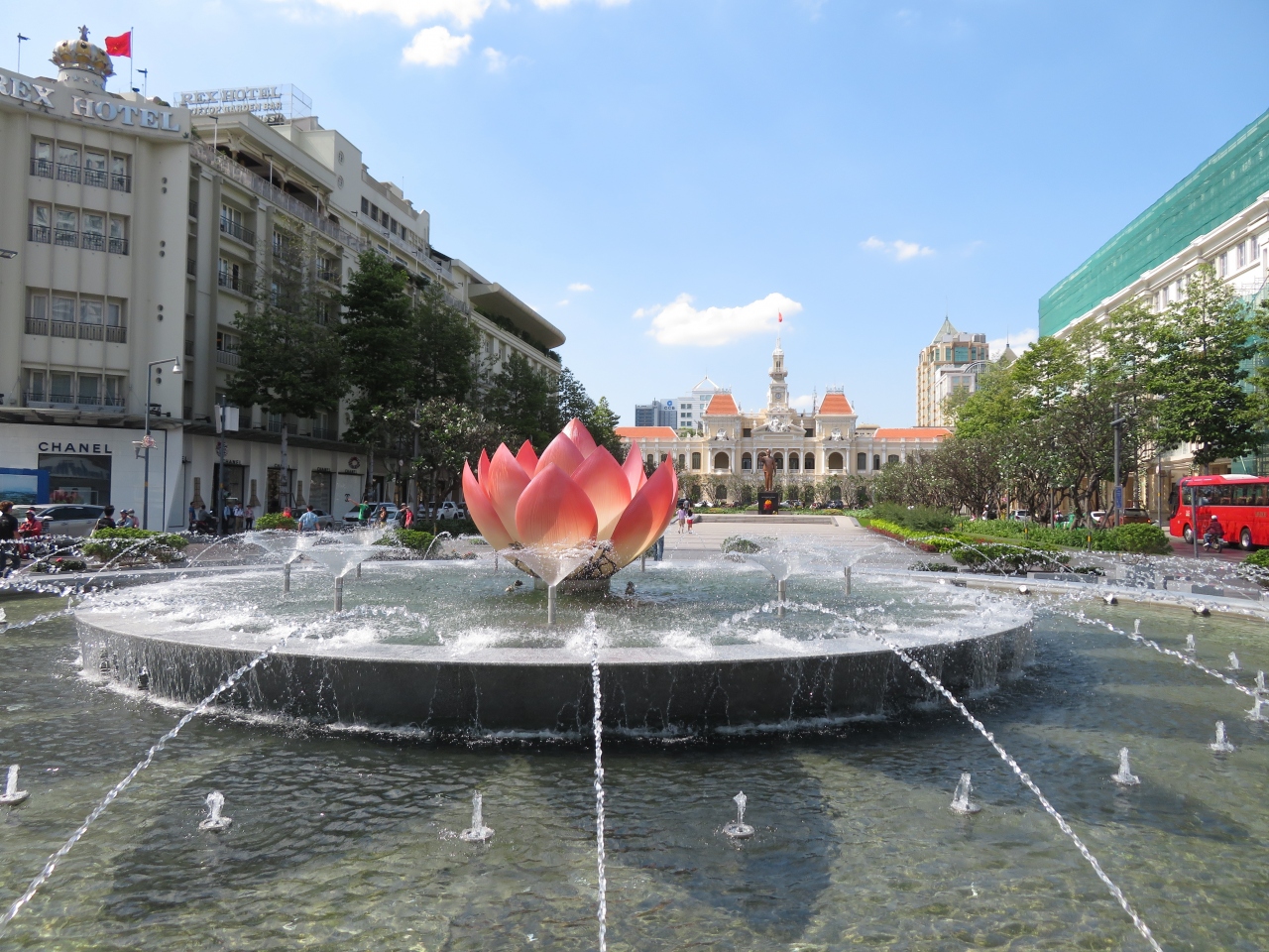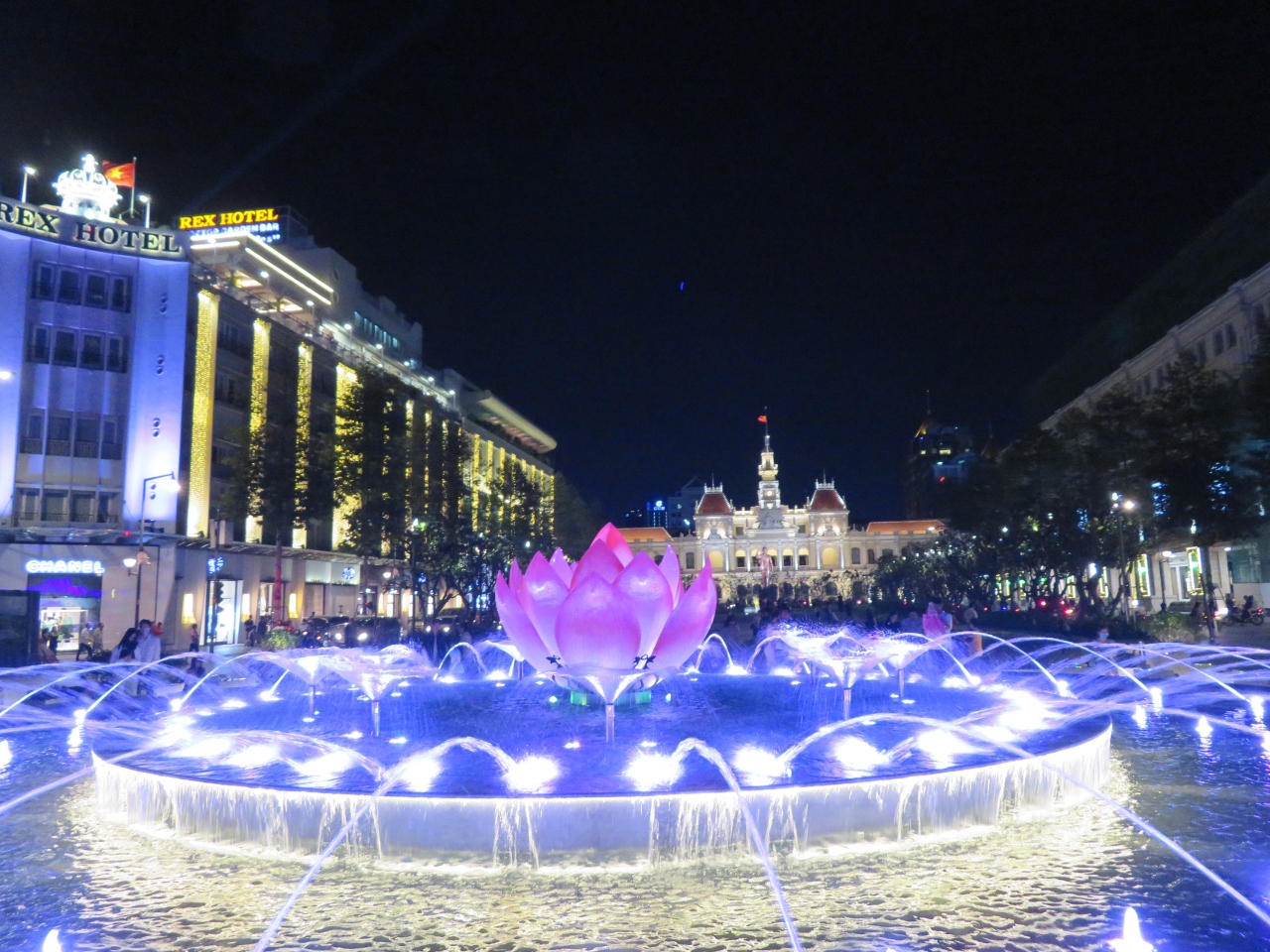 夜になると、ホーチミン人民委員会庁舎や周囲の建物、広場の池まできれいにライトアップされて、絵になる写真が撮れます。