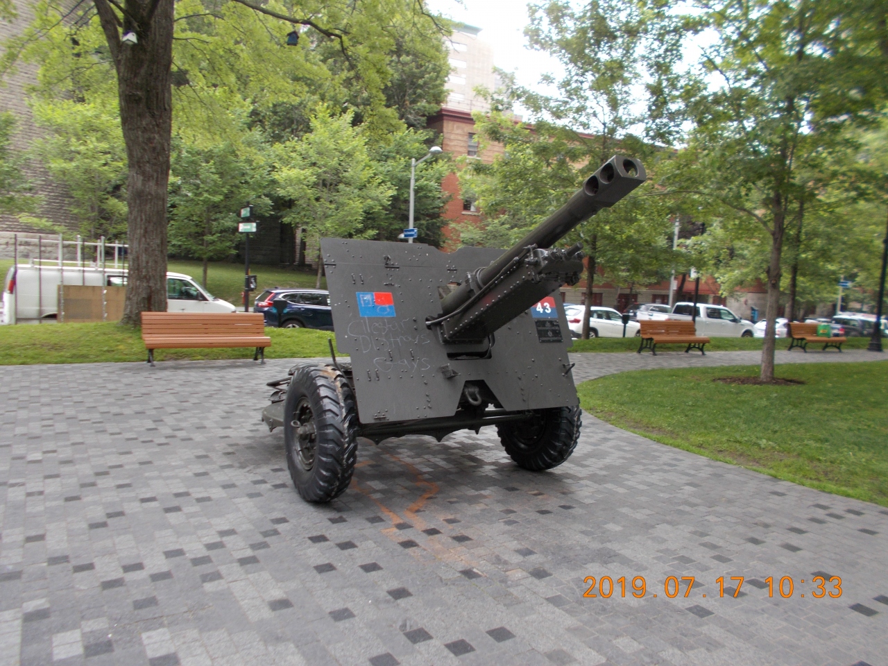 大通りのピール通りとルネ=レヴェスク通りの交差点にある。北西側と南東側に広がっている。マクドナルドの像や大砲や大砲を打つ車などの模造が置いてある。たくさんのリスが木々や草地を這いまわっていたり、ネズミや鳩が地面の餌をついばんでいた。