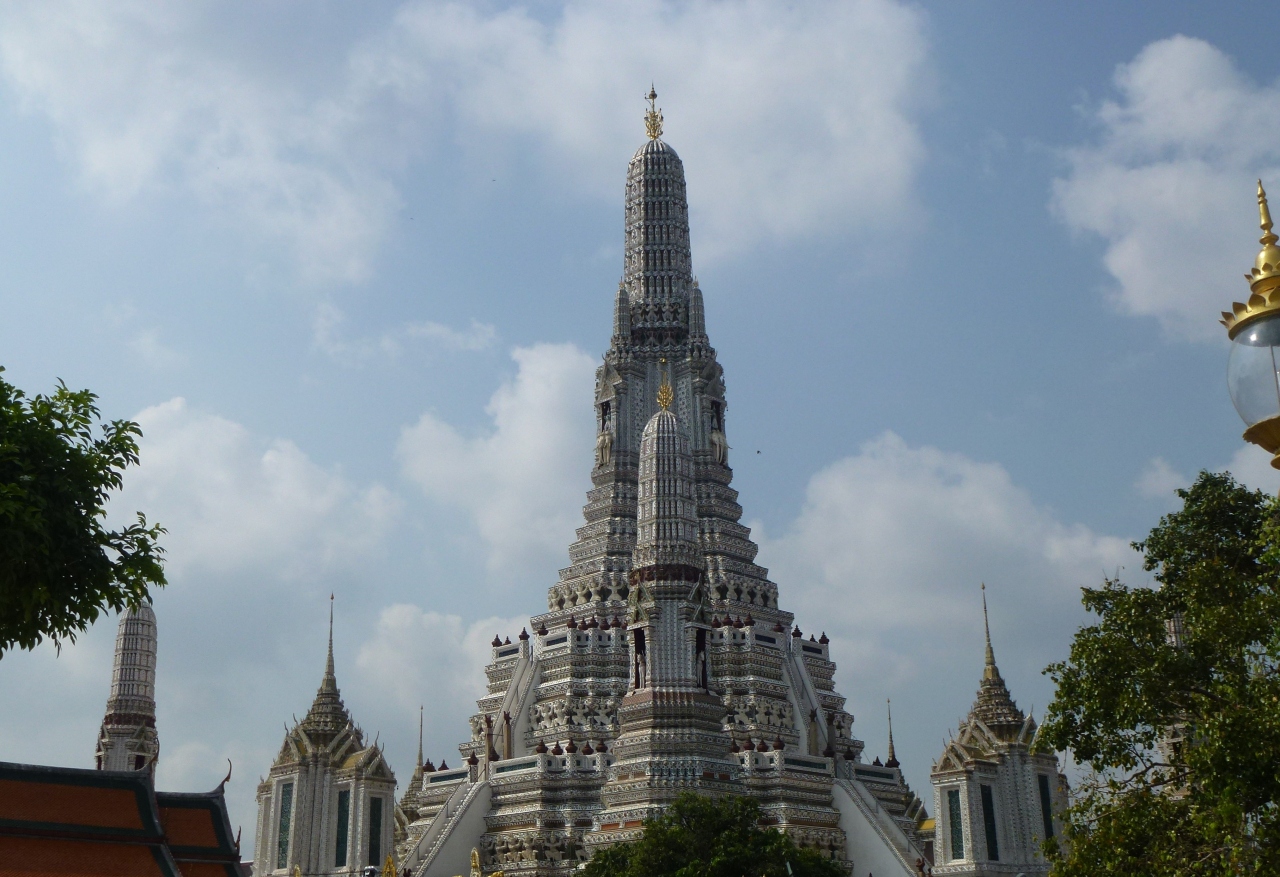 ワットアルンの象徴ともいえる仏塔は、中央の66mの高さの大仏塔(プラプラーン)と、その周囲の4つの方角に建てられた4つの小仏塔(プラーン)です。大仏塔は3つの階層から成り、1段目は鬼、2段目は猿、3段目は天使の彫刻が施されています。高いのでよく見えませんが、仏塔の上にはヒンドゥー教の神々が祀られているようです。この大仏塔は、ヒンドゥー教の聖地カイラーサ山をモチーフにしているそうです。