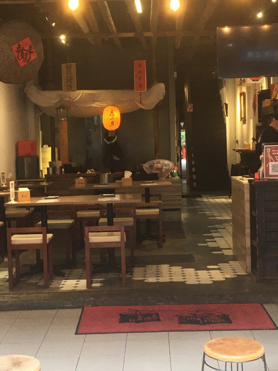 度小月という赤いちょうちんに風情があって、とてもよいです。街のレトロな気分に合わせて、店内もテーブルや椅子もレトロ、壁の雰囲気もレトロでした。台北店なので、そこまで甘くなく、塩もきいた味付けで美味しかったです