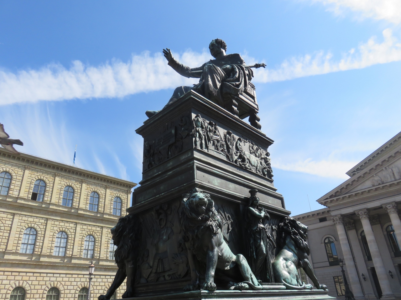 ハプスブルク家出身のドイツ国王で、バイエルンの初代王であるマクシミリアン1世ジョセフへの敬意の象徴だと感じました。彼の右手は上に持ち上げられ、彼は左手の笏をつかんでいて、彫像は細い彫刻が施された台座の上に置かれ、台座の底はライオンやその他の装飾に囲まれていました。