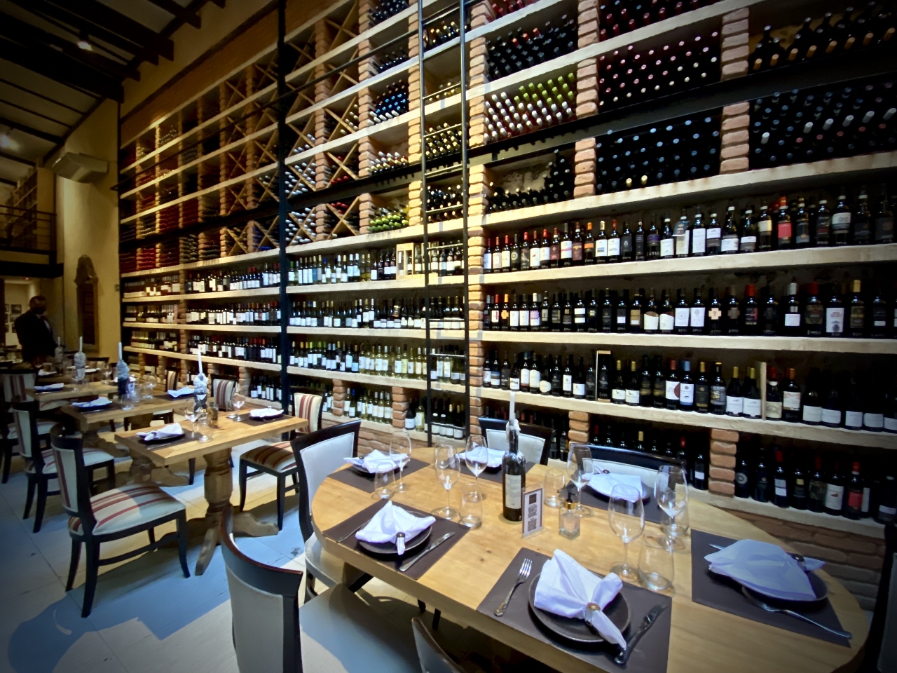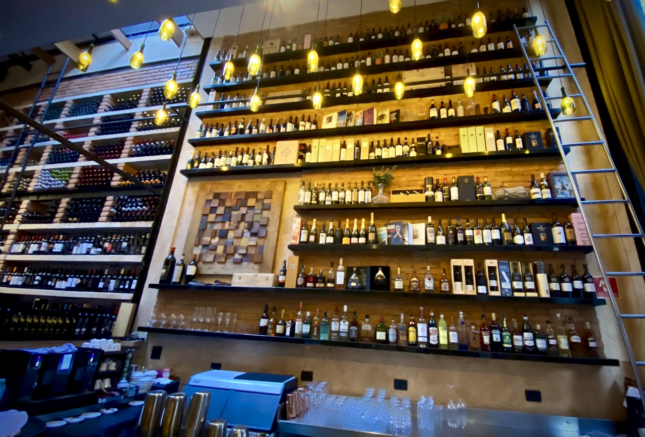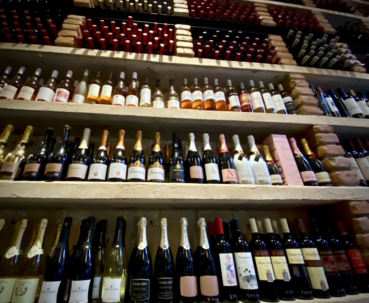 入った途端に目の前に迫るほど壁に積み上げられたワインや酒のボトルの数が圧巻です。そこから一本づつ選べるって…すごい…。でも、上の方は全くよく見えねぇし…