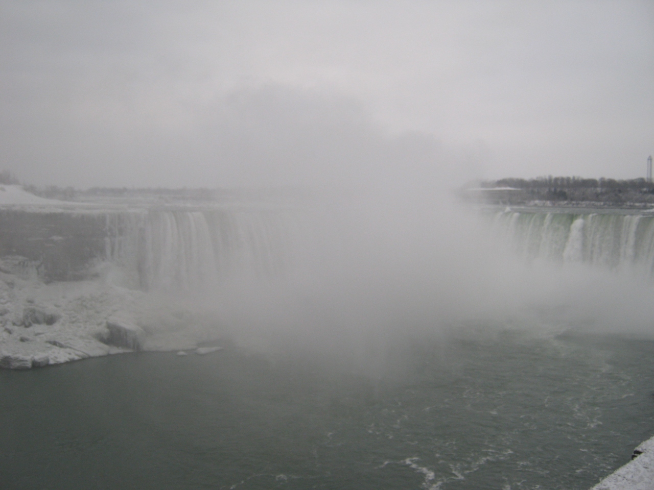 カナダ側の滝はUの字(馬蹄の形)になっていて、直線的なアメリカ側の滝よりきれいでした。水しぶきがすごいので、煙っていて、1月に行ったので水しぶきが冷たかったです。滝のすぐそばまで行けるので、ナイアガラに行ったらまずカナダ側に行くべきだと思います。