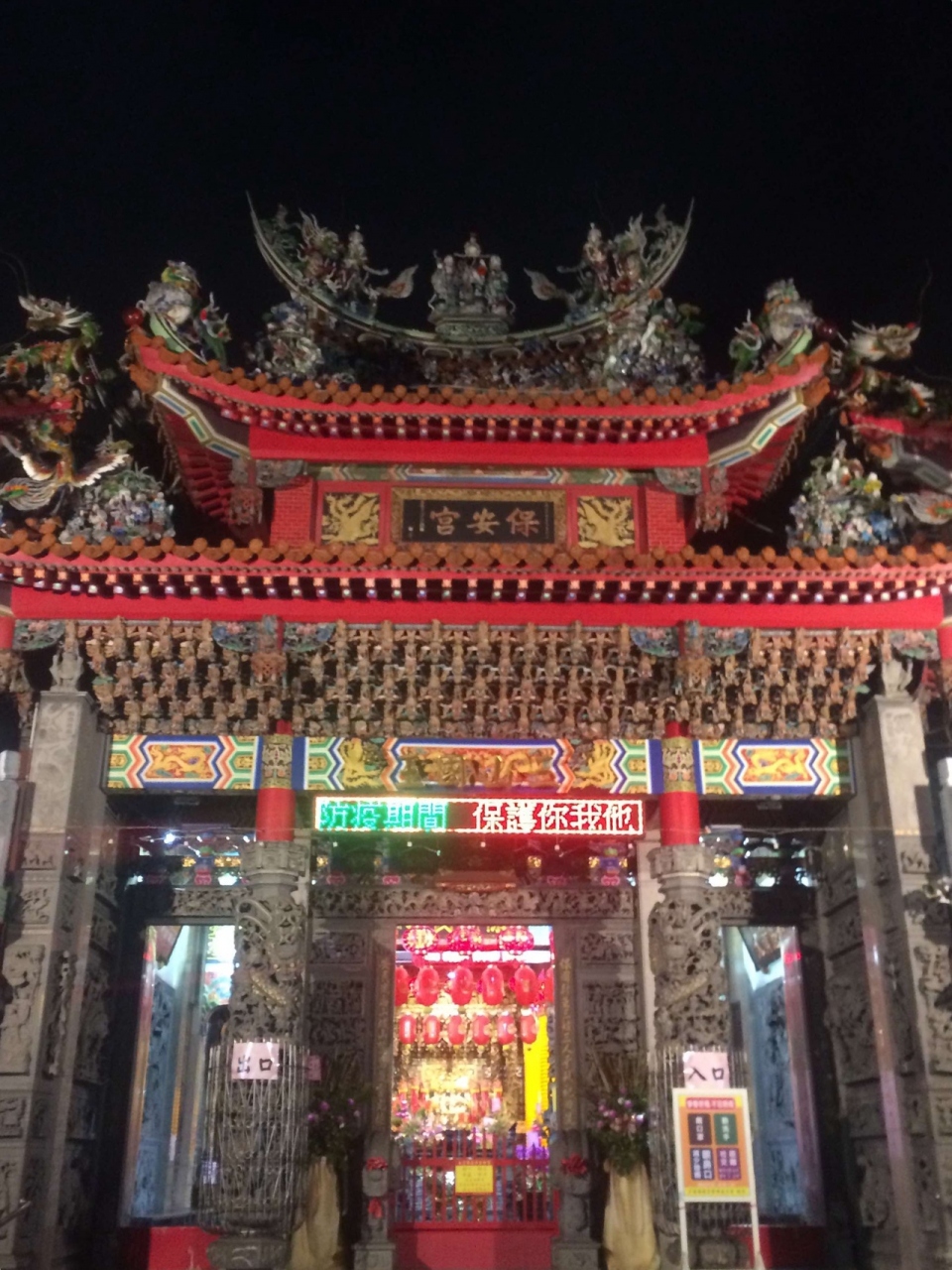 台湾人が好きな神様が祀られているお寺とのことです。手を合わせて拝んでいく人が結構いました。日本人よりも信心深い国民が多く感じました。中華風の派手な門とお寺なんですが、現代風の電子掲示板がミスマッチで残念でした。