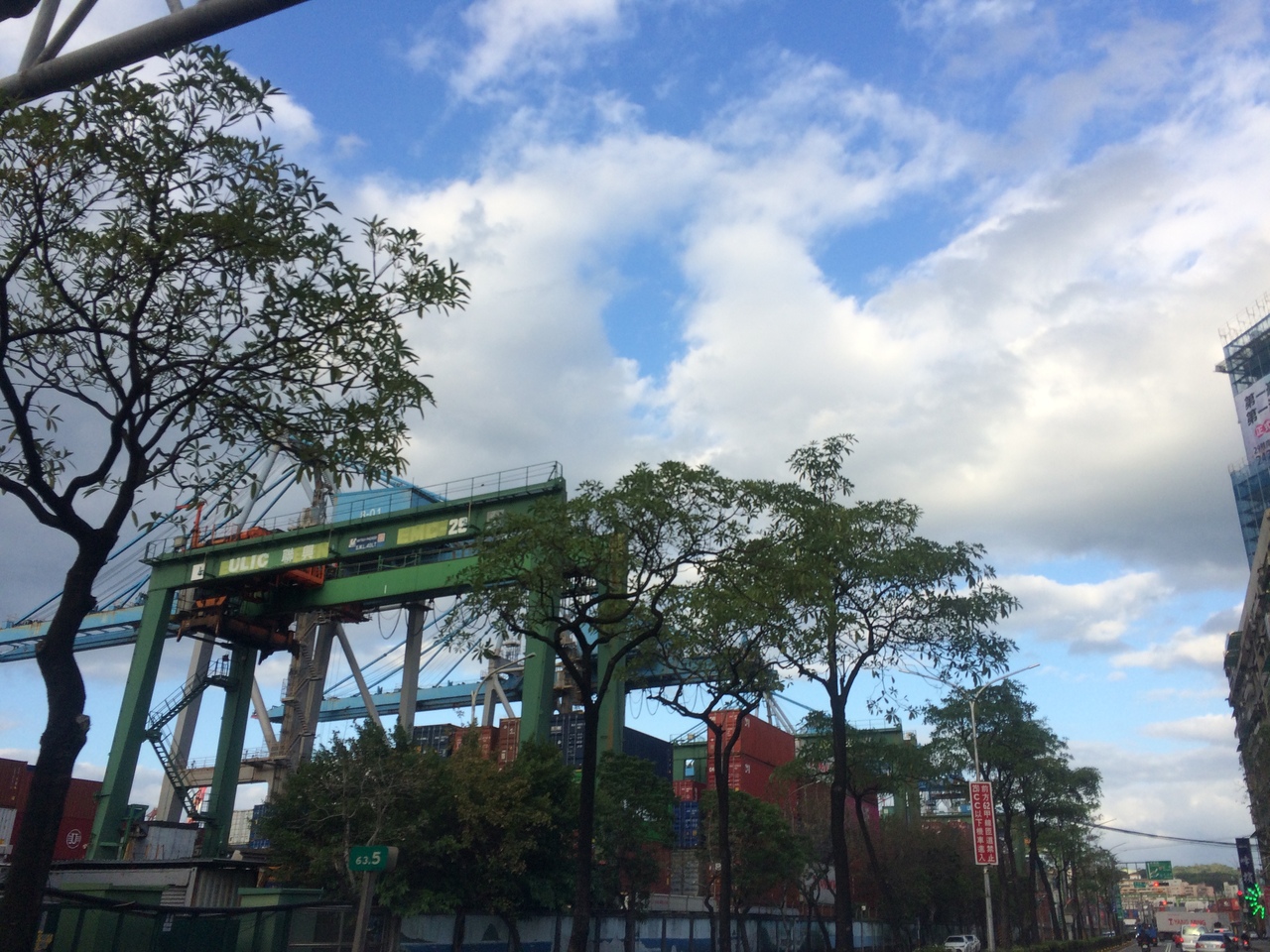 海沿いを走っている通りでした。海に出ていく船に乗せるコンテナも良く見えました。通り自体に並んでいる建物はほとんどが住宅になっていて、全体的に、結構シンプルな建物ばかりでした。バイクの流れがはやかったです。