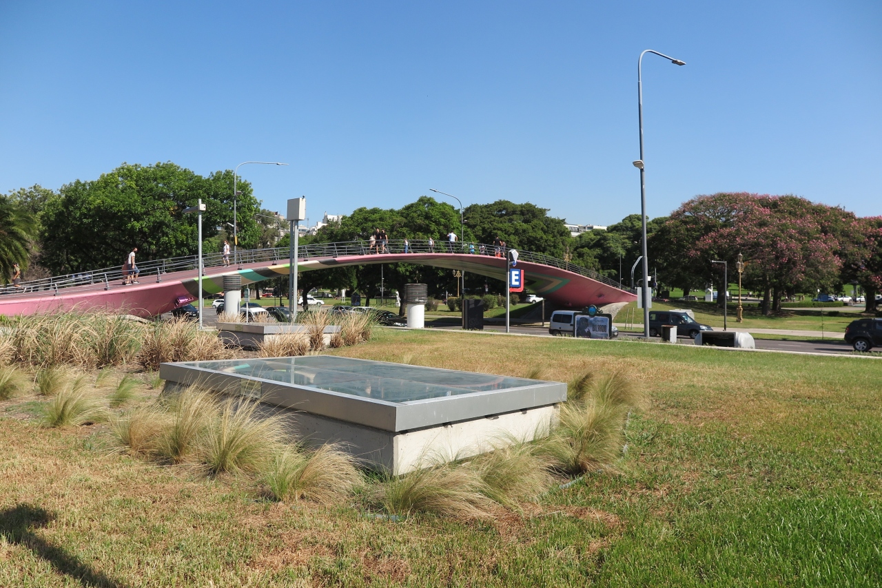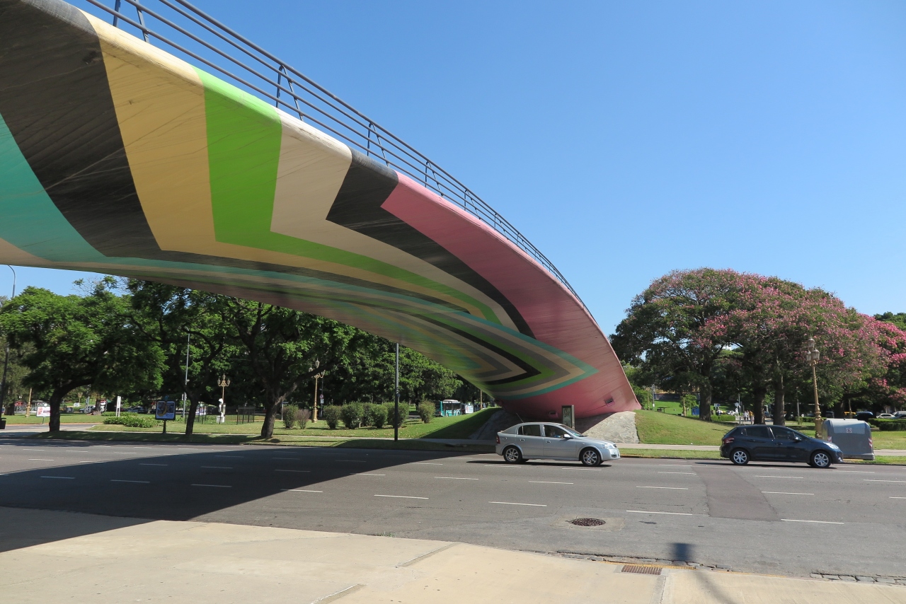 地下鉄のブエノスアイレス大学法学部の駅前からリベルタドール通りを横断してレコレタ方面へ行くための歩道橋です。歩道橋とはいえ広々とした橋で、底面がカラフルにペイントされています。巨大な神殿のようなブエノスアイレス大学法学部の建物を撮影するのに絶好の撮影スポットです。11月には法学部の建物の向かいに、ブエノスアイレスで一番キレイなハカランダ並木が見られます。
